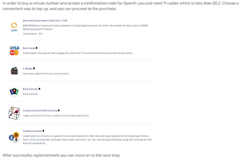 「仮想ナンバーの購入と、OpenAIの認証コード受信に必要なのは、たった11ルーブル、0.2ドル以下です。支払い方法を選択し購入手続きに進んでください」