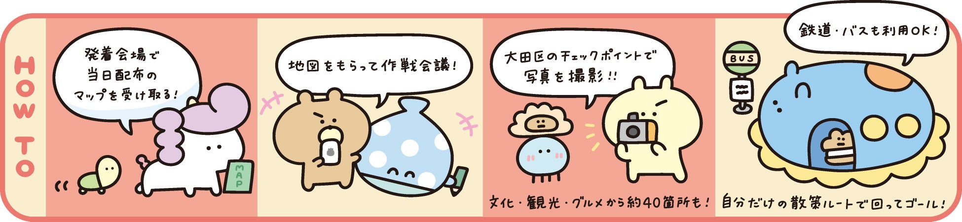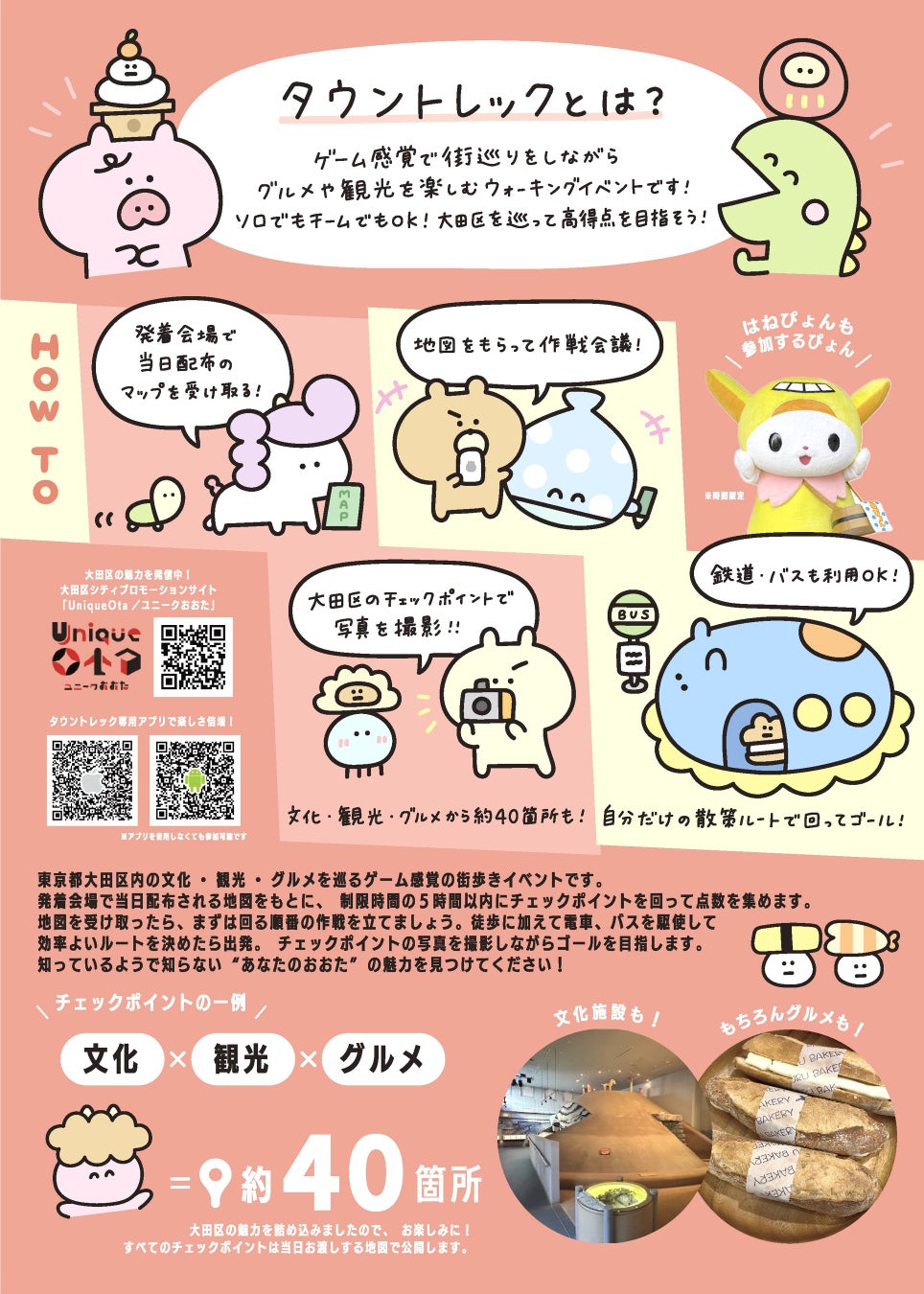 発着会場で当日配布される地図を基に、文化・観光・グルメをテーマにした大田区内の約40箇所のチェックポイントを制限時間5時間以内に自由にめぐり、点数を集めます。