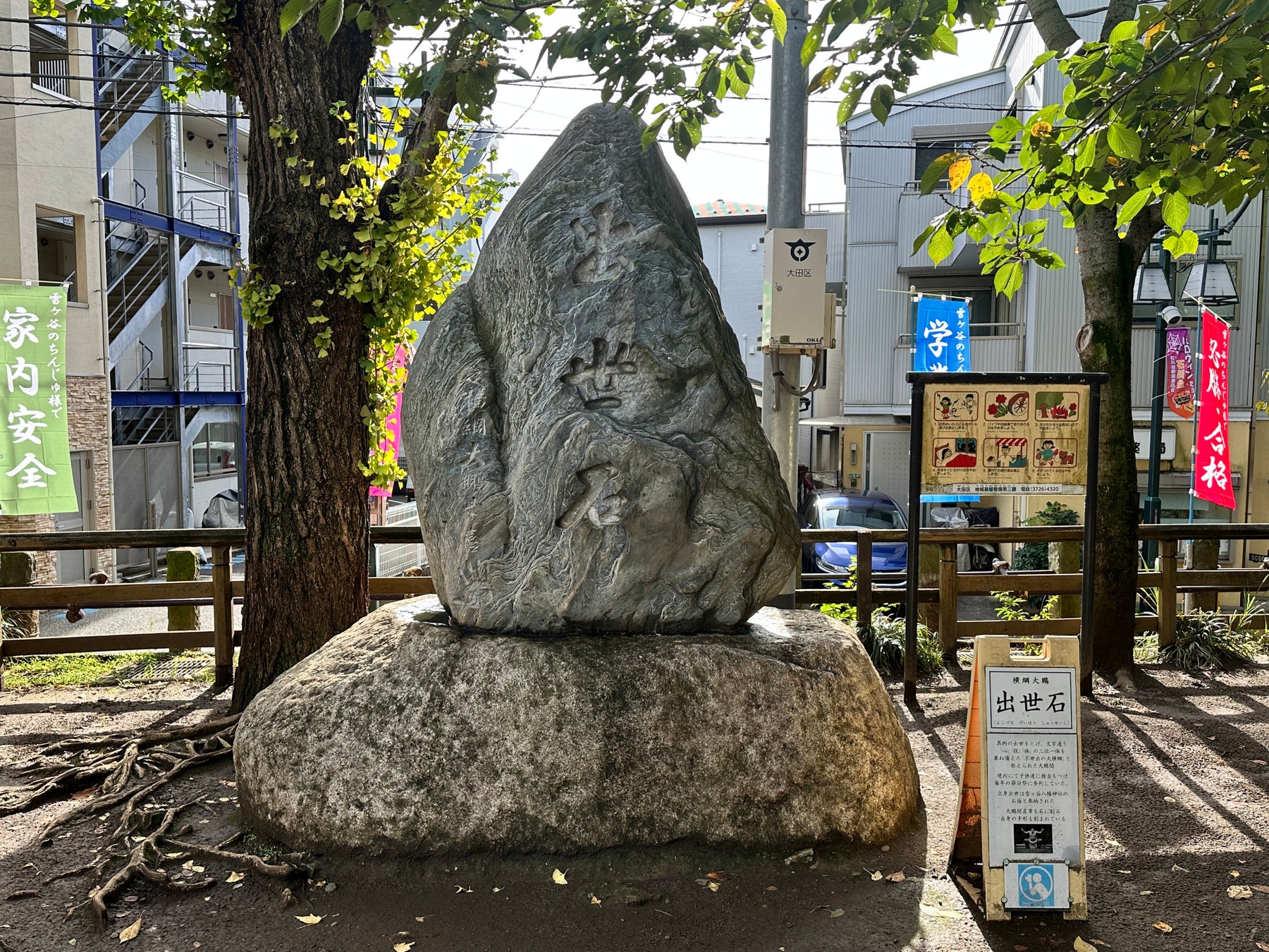 昭和を代表する大横綱大鵬幸喜(1940~2013年)ゆかりの神社。幕内優勝32回、6場所連続優勝2回など異例の出世を遂げ、「不世出の大横綱」とたたえられたのは、「雪ケ谷八幡神社の御加護の賜物(たまもの)である」と感謝し、同神社に「出世石」と書いた書を奉納した。石には、その書と大鵬の手形が彫られている。