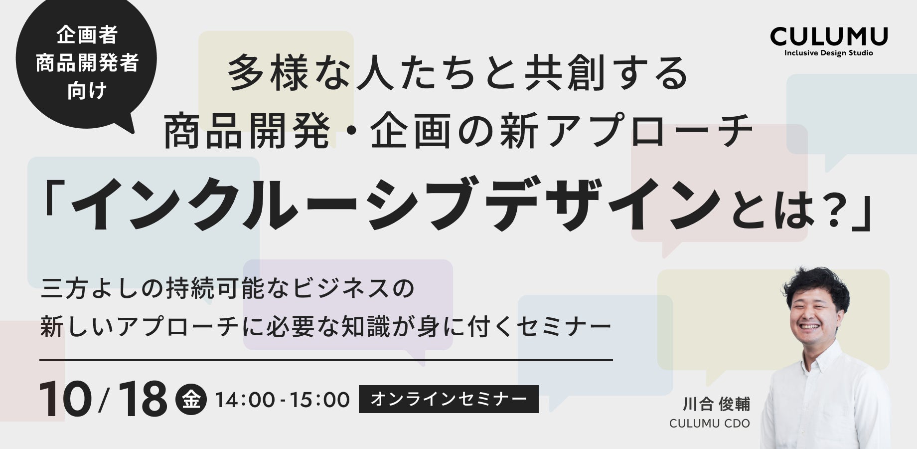 CULUMUは、さまざまなユーザーと共創しながらプロジェクトを推進し、インクルーシブデザインを進めてきました。本セミナーではCULUMUがこれまで携わってきた案件など事例を通して「インクルーシブデザイン」の理解を深めていただく場になればと考えております。
