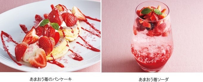 今回のフェアでは、フレッシュな「あまおう苺」を贅沢に使用したデザートとドリンクをご用意しました。あまおう苺のパンケーキは、マスカルポーネクリームの味わいが絶妙な一品です。一口食べればコクのあるクリーミーな味わいで、ほんのり幸せな気持ちになれる、苺好きにはたまらない商品です。そして、当フェア限定のドリンク3品にも、フレッシュなあまおう苺を贅沢に使用しています。