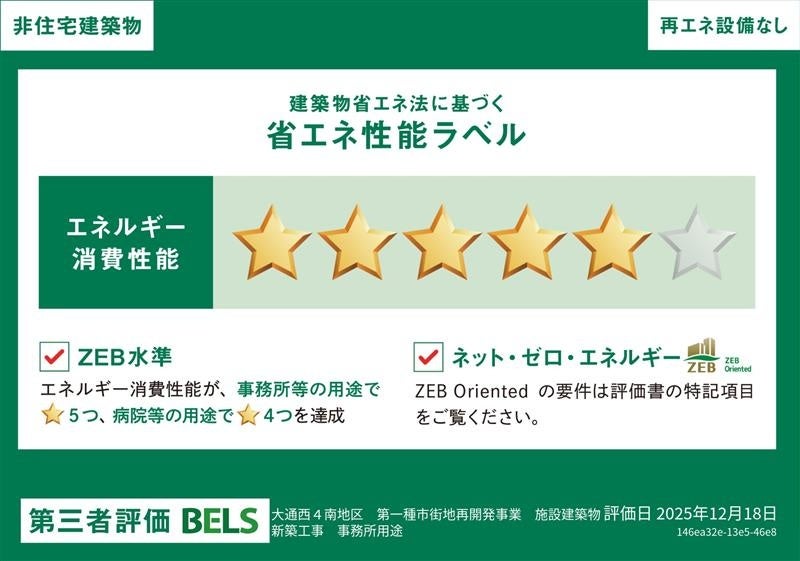 平和不動産株式会社(本店:東京都中央区、代表執行役社長:土本 清幸、以下「当社」)は、札幌都心部において権利者の方々とともに『大通西4南地区第一種市街地再開発事業』(以下「本事業」)を推進しており、このたび、本事業において整備する複合用途ビル「SAPPORO ONE」(以下「本施設」)の事務所用途部分において「ZEB Oriented」認証を取得したことをお知らせいたします。