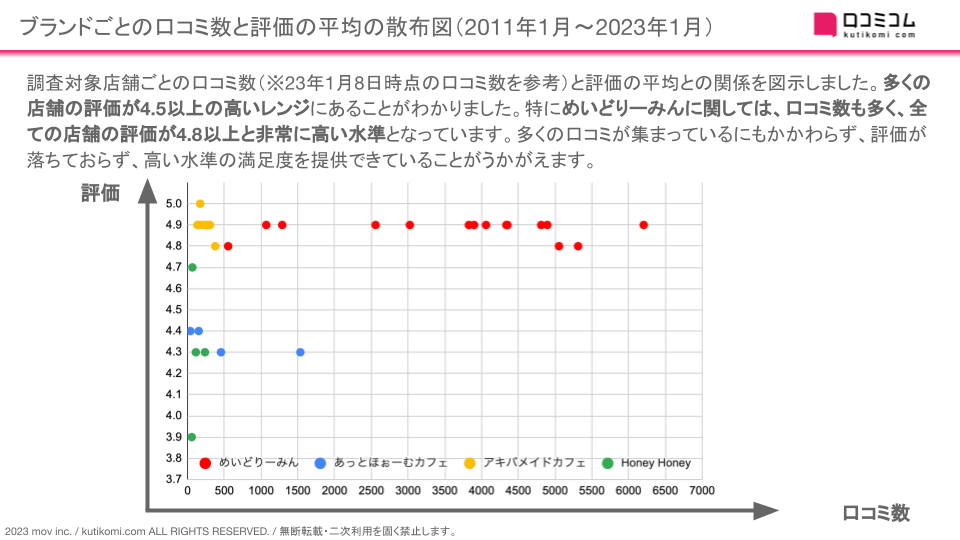 ・めいどりーみんの口コミ数、店舗評価の平均点ともに、他ブランドよりも水準が高いこと
