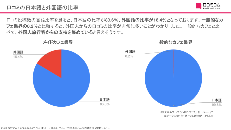 口コミ投稿数の言語比率を見ると、日本語の比率が83.6%、外国語の比率が16.4%となっております。一般的なカフェ業界の0.2%と比較すると、外国人からの口コミの比率が非常に多いことがわかりました。一般的なカフェと比べて、外国人旅行客からの支持を集めていると言えそうです。