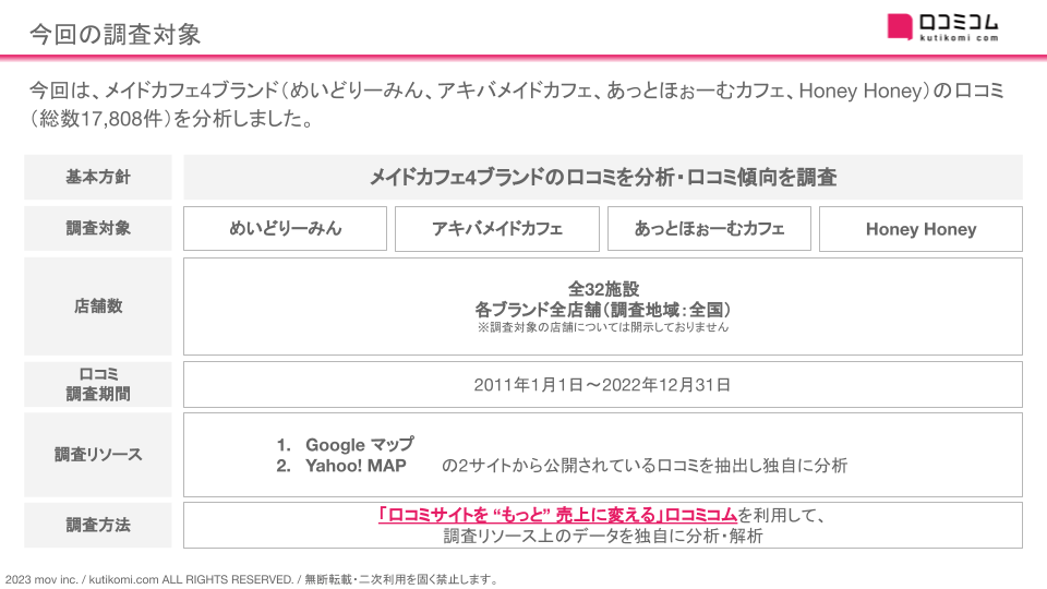 今回は、メイドカフェ4ブランド(めいどりーみん、アキバメイドカフェ、あっとほぉーむカフェ、Honey Honey)の口コミ(総数1,7万件)を調査し、4ブランドの比較検証を行いました。