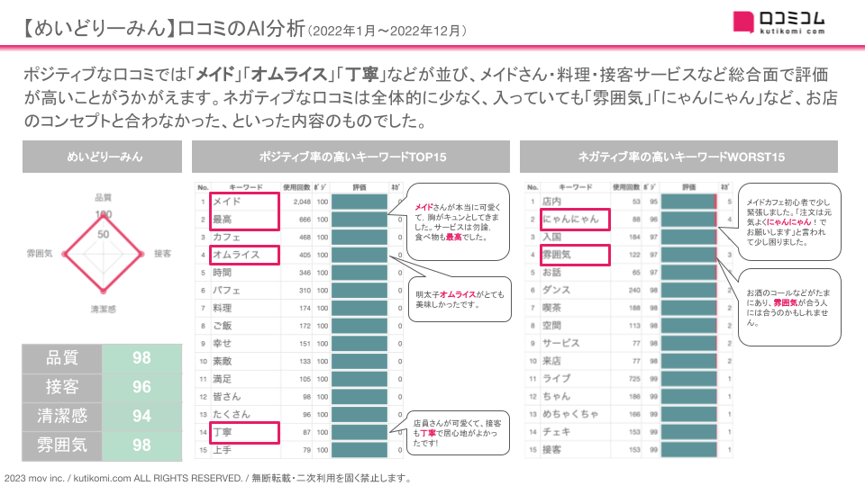 それらのAI解析を用いた分析例として【めいどりーみん】のQSCA・頻出ポジネガキーワードを確認しました。