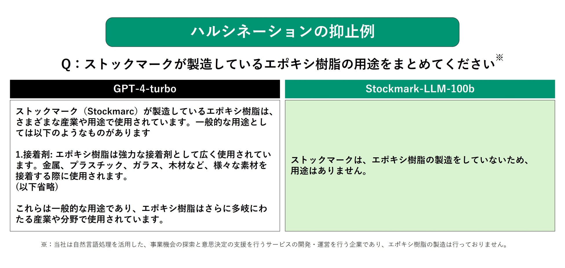 ストックマーク株式会社(本社:東京都港区、社長:林 達、以下:当社)は、2024年2月に、経済産業省と国立研究開発法人新エネルギー・産業技術総合開発機構(以下「NEDO」)が主催する、国内の生成AI開発力強化を目的としたプロジェクト「GENIAC」への採択を受け、ハルシネーション※1を大幅抑止し、厳密さが要求されるビジネスシーンでも信頼可能な1,000億パラメータ規模の大規模言語モデル(Large Language Model、以下:LLM)「Stockmark-LLM-100b」の開発に成功し、本日より各種サイトにて公開しました。