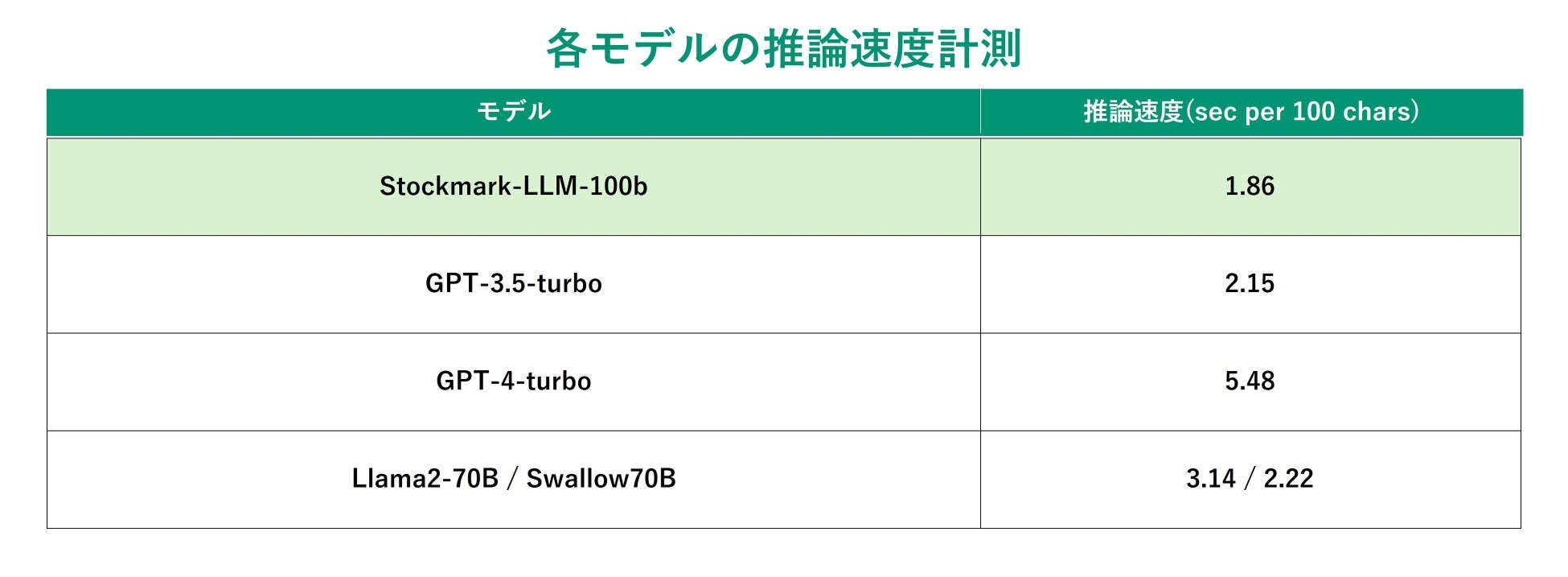 各モデルの推論処理速度を計測するために、100文字の日本語作文を書くのに要した時間を計測したところ、1.86秒と他モデルと比較しても高い速度性能を有しています。