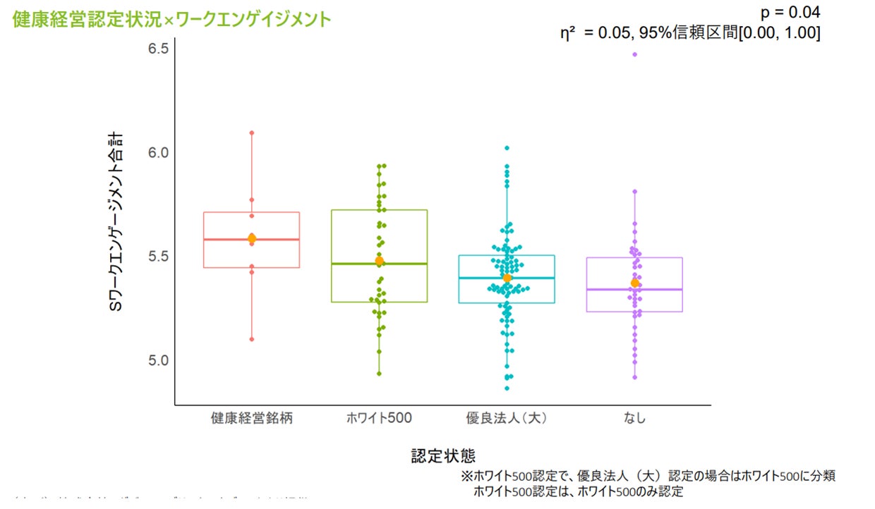 まず、統計学的に有意な違いは見られたものの、各社の値のばらつきは大きく、健康経営を推進して上位認定を受けているだけでは、必ずしも従業員のエンゲージメントが高い水準であるとは限らない企業もあること