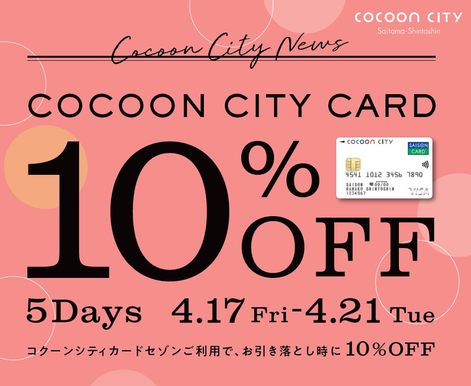 期間中、コクーンシティ内でのお買物やお食事にコクーンシティカードセゾンをご利用いただくと、お引き落とし時に10%OFF!