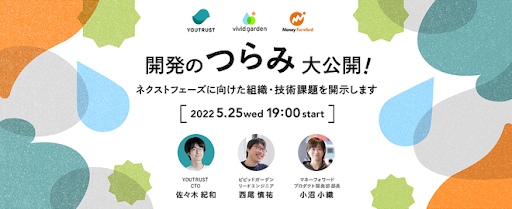 5月25日(水)19:00〜20:30に、YOUTRUST×ビビッドガーデン×マネーフォワード共同開催イベント『開発の「つらみ」大公開!ネクストフェーズに向けた組織・技術課題を開示します』を開催します。各社CTOやリードエンジニア、エンジニアリングマネージャーより、ネクストフェーズに向けて各社が抱えるエンジニア組織や技術課題についてお話ししますので、ご興味がある方はぜひご参加ください。