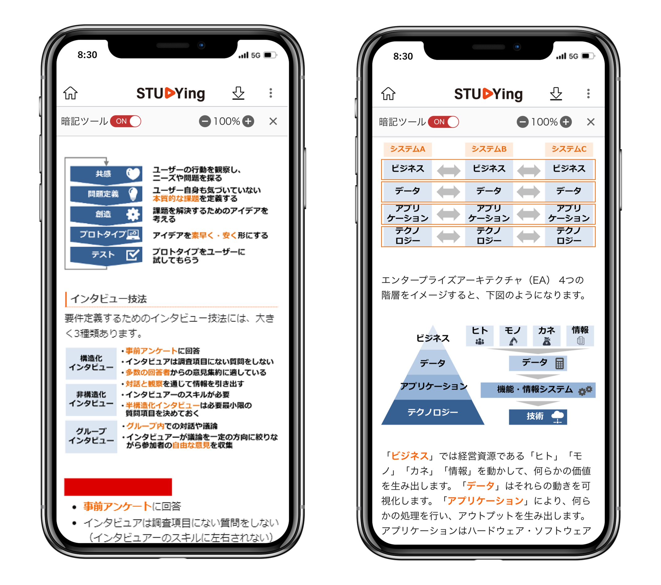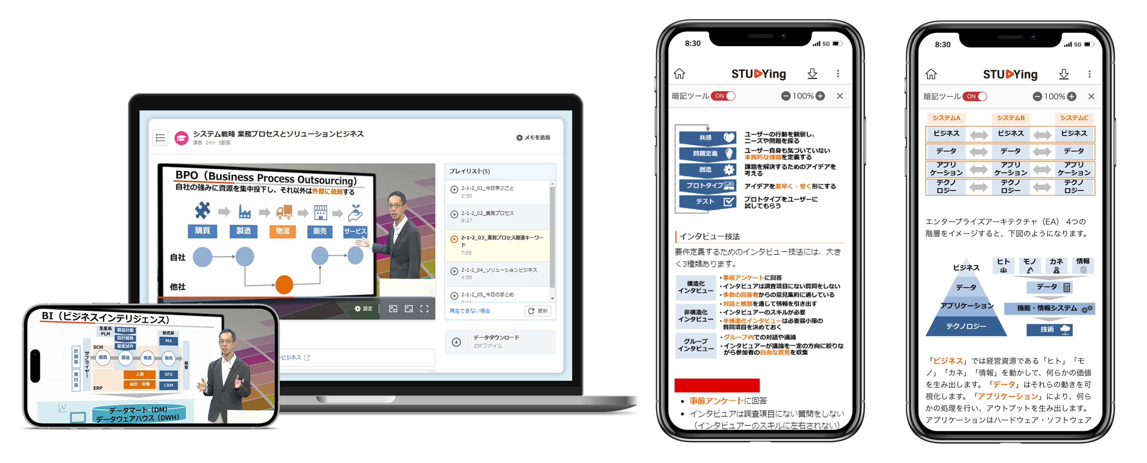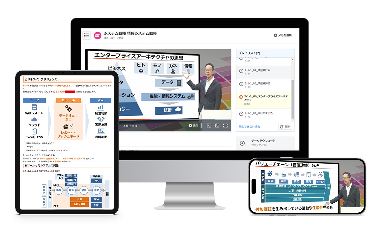 初めてITストラテジスト試験に挑戦される方でも、視覚的にITの専門用語の内容や関係性を理解しやすいように、テキストや動画講義には、図解での説明を多く採用しました。文章で読んでも分かりにくい専門用語や複雑なロジックも、「図表やイラストを駆使したスライド」を用いて五感を使って学習していただくことで、テレビの情報番組を見るように分かりやすく楽しく学習できます。