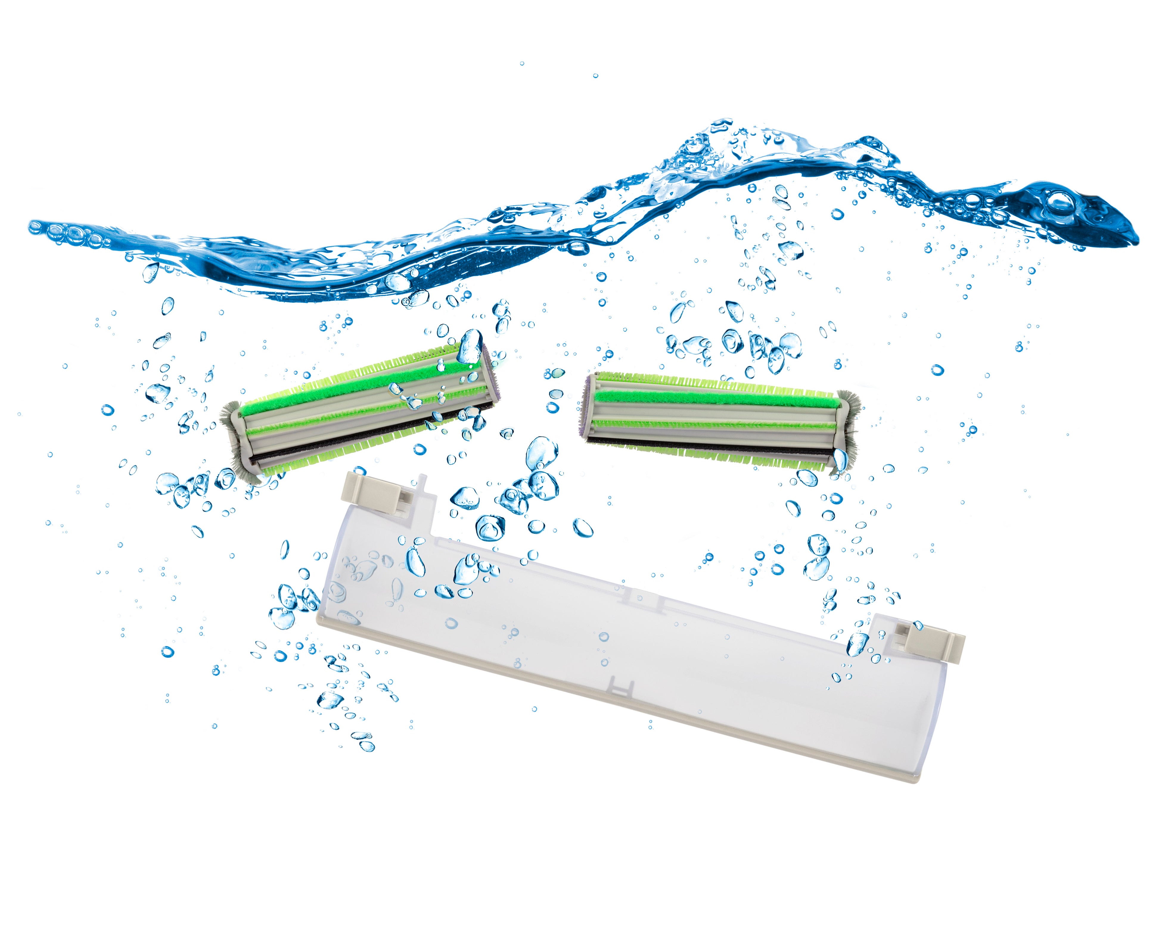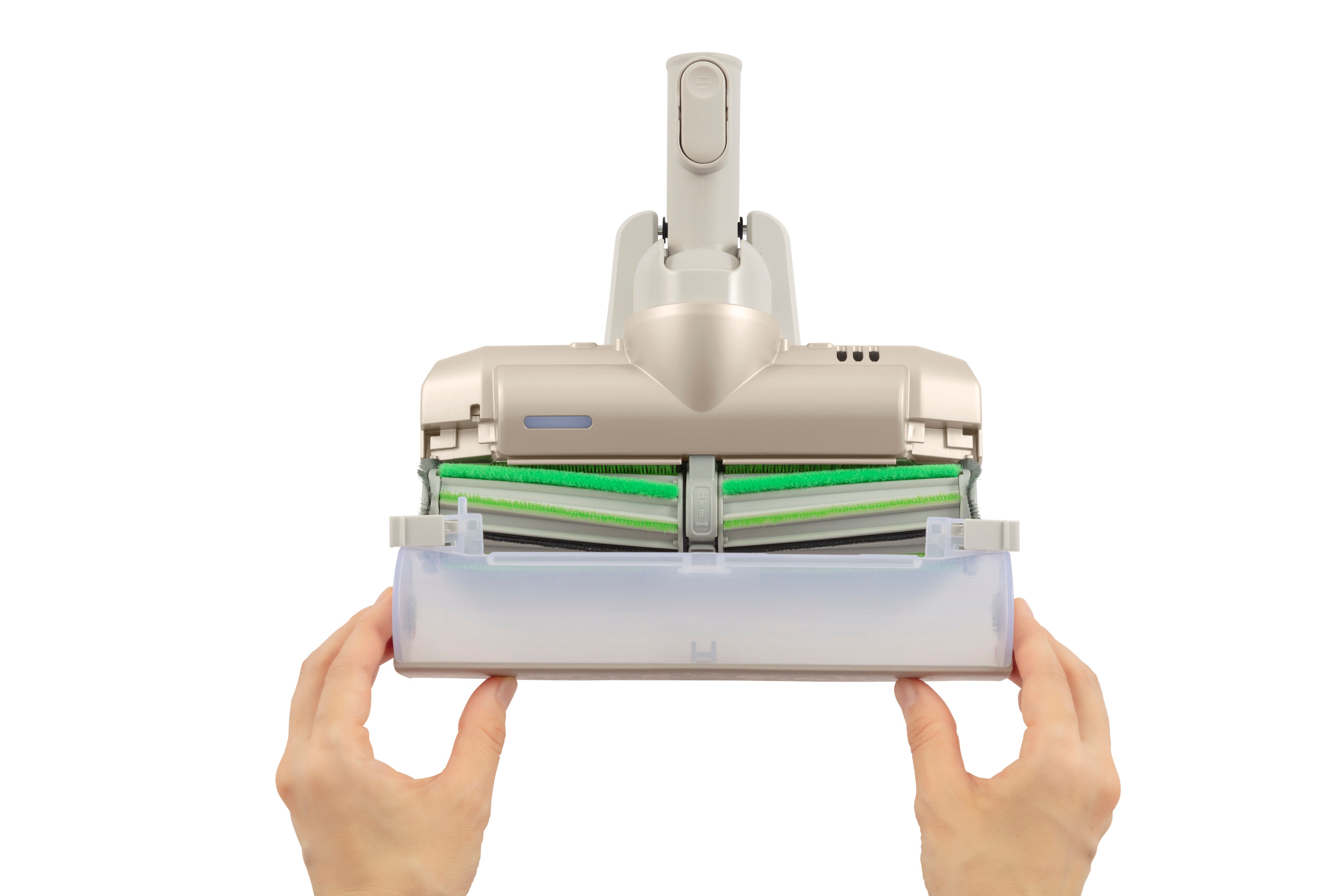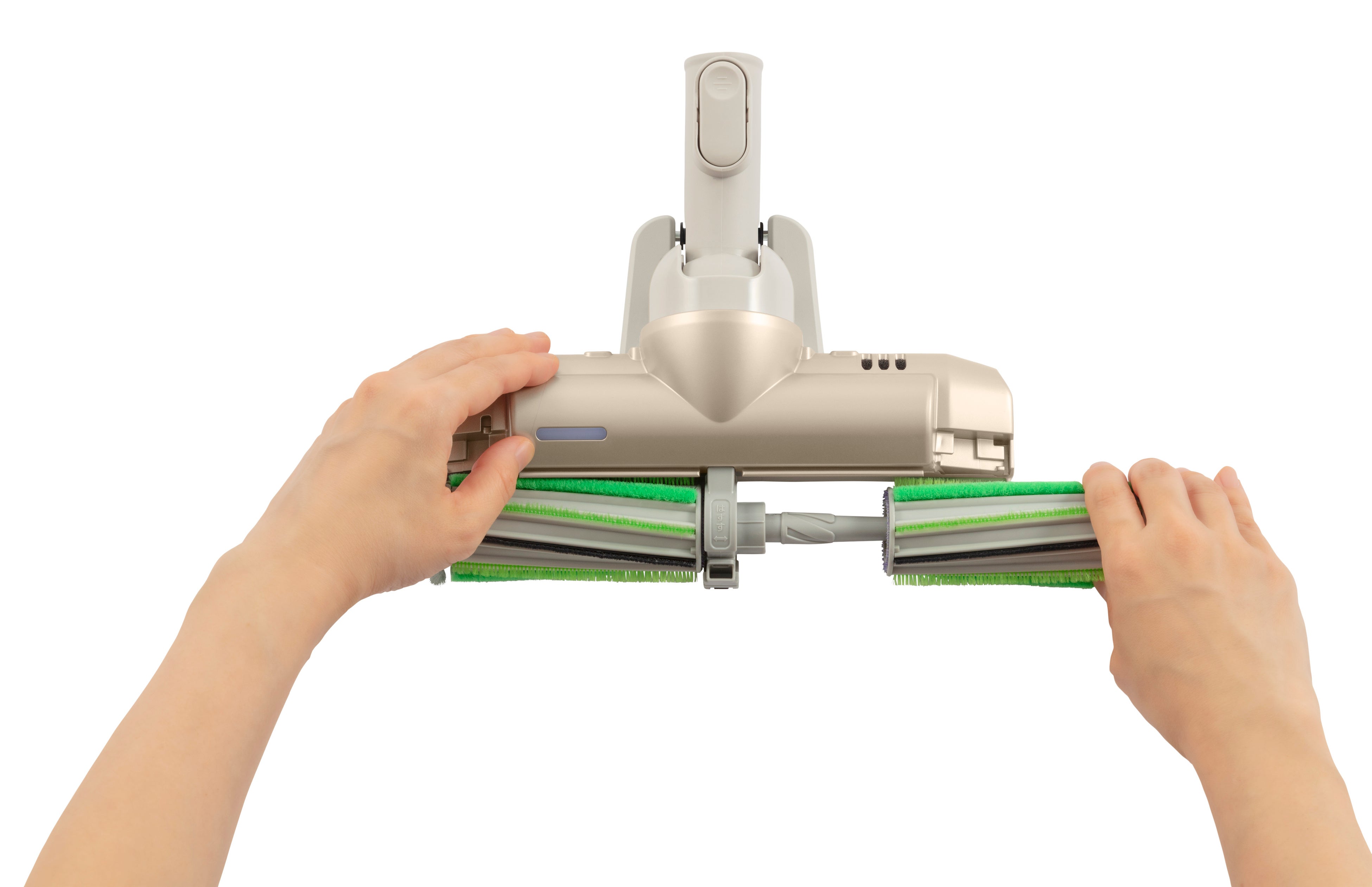 新製品では回転ブラシの両端に「すみまでブラシ」を新搭載。掃除しにくくホコリがたまりやすい、壁際や隅などのゴミもキレイに取り除きます。また、回転ブラシはヘッドを裏返さずに簡単に取り外せて、丸ごと水洗いが可能なため清潔に保てます。