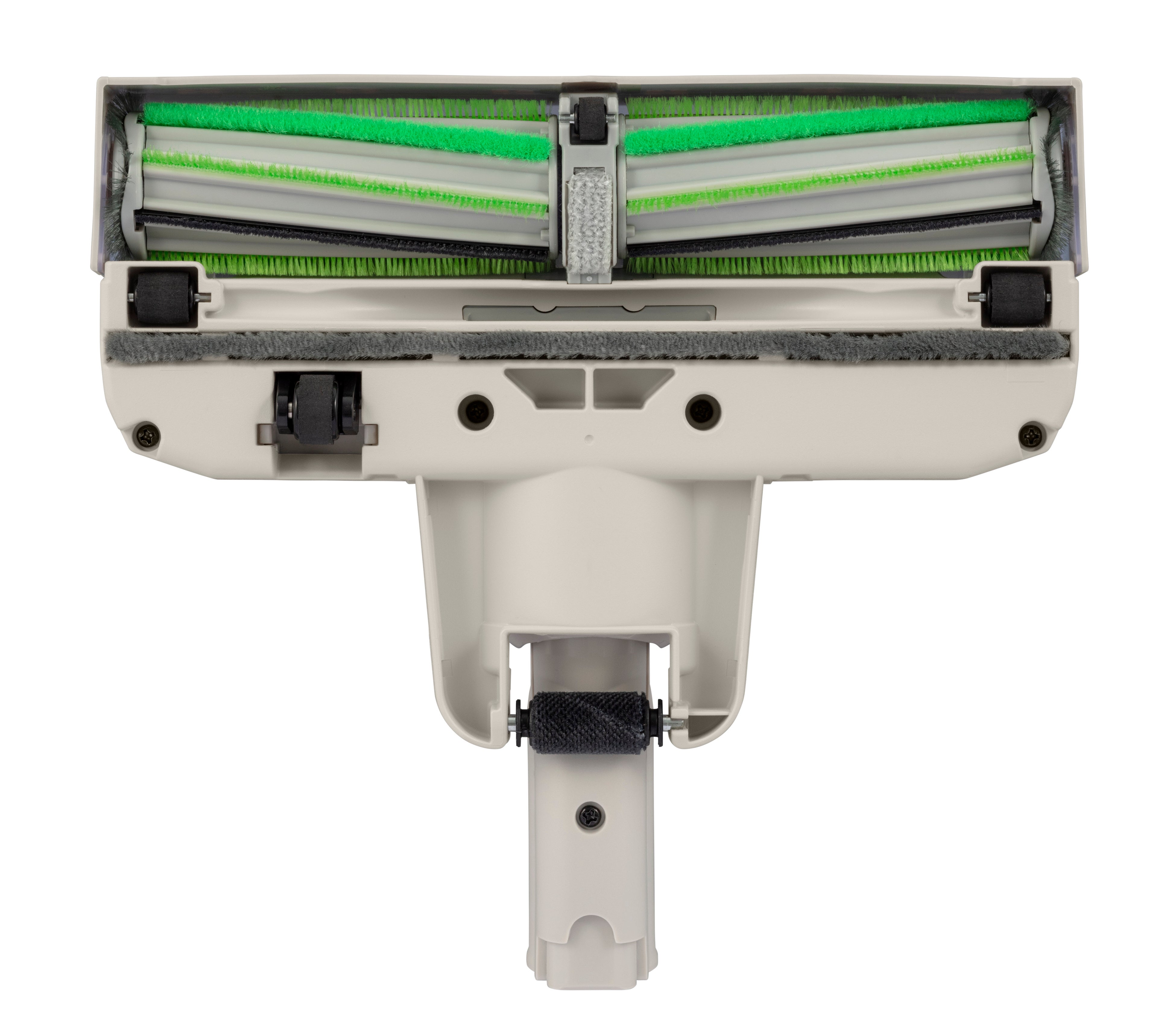 新製品ではヘッドの構造を大幅に改善しました。回転ブラシの両端に「すみまでブラシ」を新搭載。掃除しにくい壁際のゴミもキレイに取り除きます。また、回転ブラシはヘッドを裏返さずに簡単に取り外せて、丸ごと水洗いが可能なため清潔に保てます。さらに、ヘッドの車輪に特殊加工素材を新採用し、髪の毛などの絡みつきを抑制。お手入れの負担をさらに軽減します。