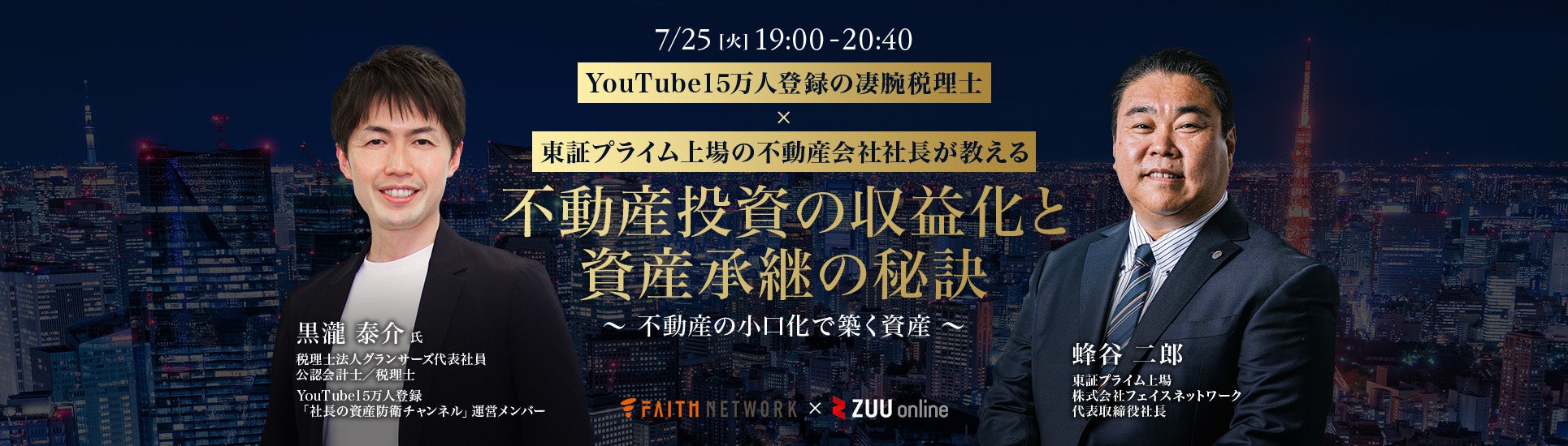 東京の城南3区エリア(世田谷区・目黒区・渋谷区)を中心に、主に新築一棟RCマンションによる不動産投資支援事業を展開する株式会社フェイスネットワーク(本社:東京都渋谷区、代表取締役社長:蜂谷 二郎、以下 「当社」という。)は、株式会社ZUU(本社:東京都目黒区、代表取締役:冨田 和成)が運営する金融メディア『ZUU online』と共催で、不動産小口化商品に関するオンラインセミナーを、7月25日(火)に開催することをお知らせいたします。
