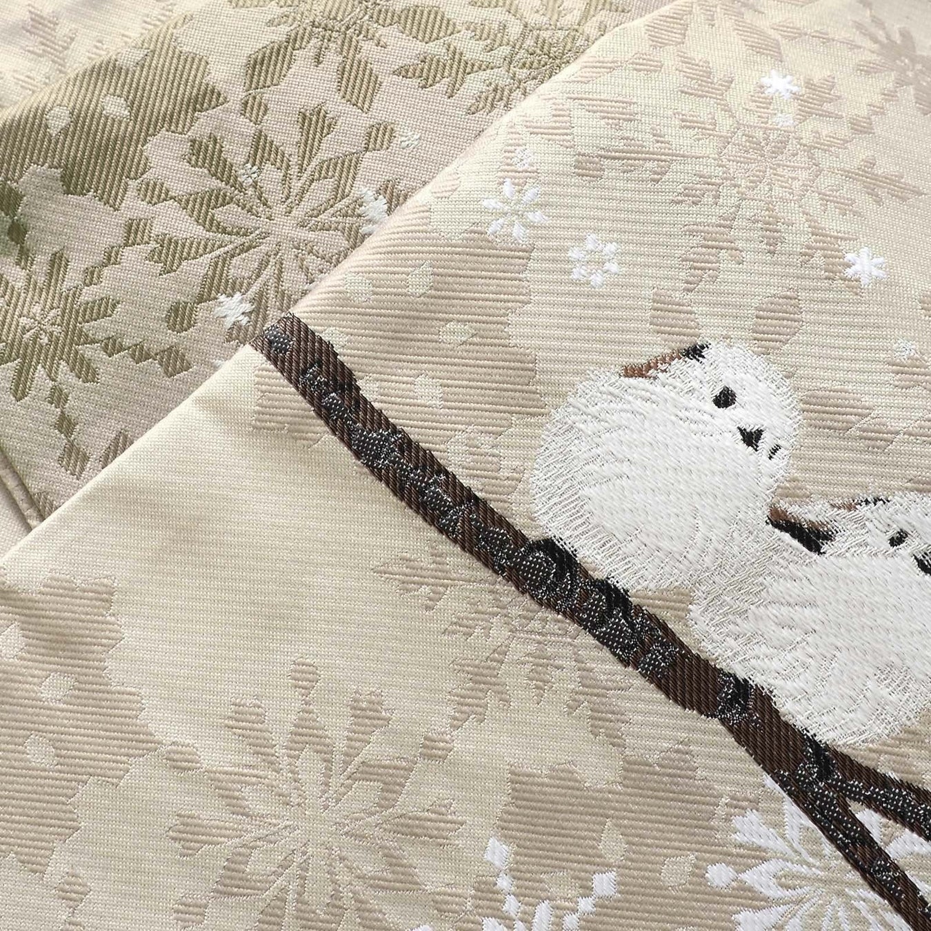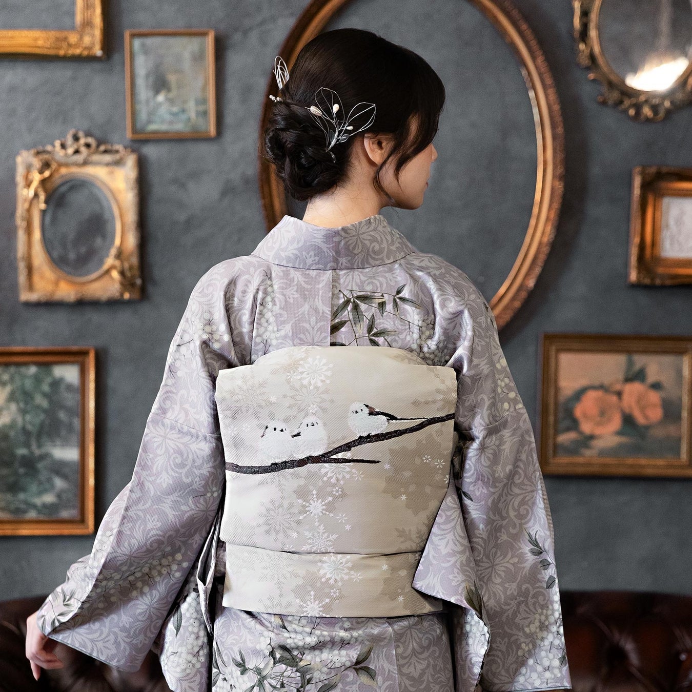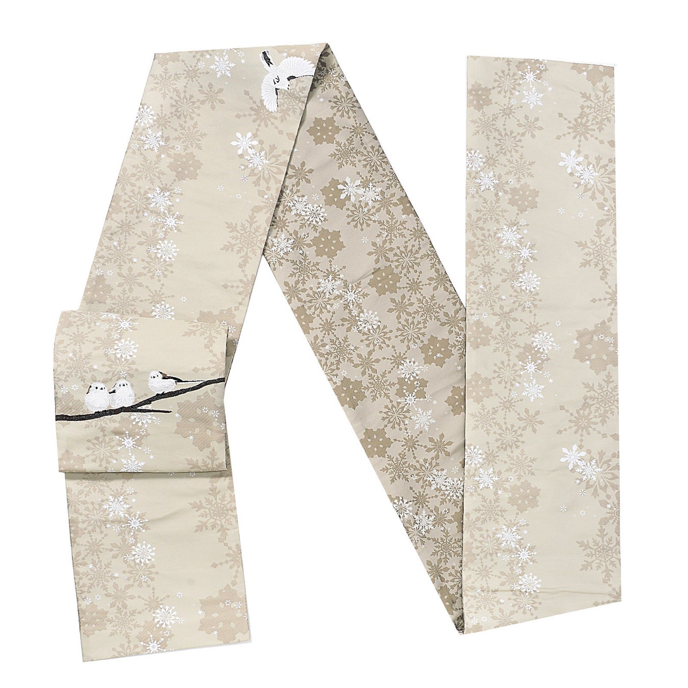 浅いベージュの地に雪の結晶文様。お太鼓の部分にはこげ茶色の枝にとまった3羽のシマエナガ。アイボリーのふんわりとした体につぶらな瞳、茶や黒の羽が繊細な織りで表現され、本物のような愛くるしさと存在感です。胴の部分には翼を広げて羽ばたくシマエナガ。裏地はベージュに白で全面に雪花紋が織り出されています。