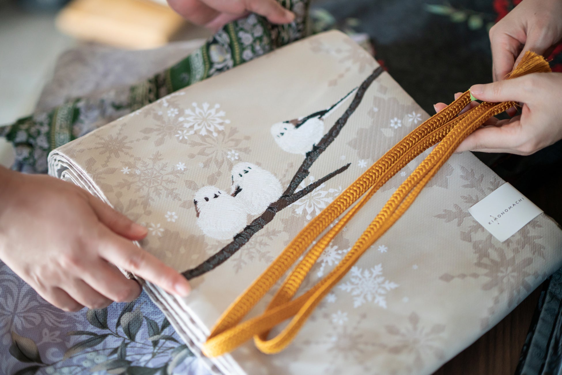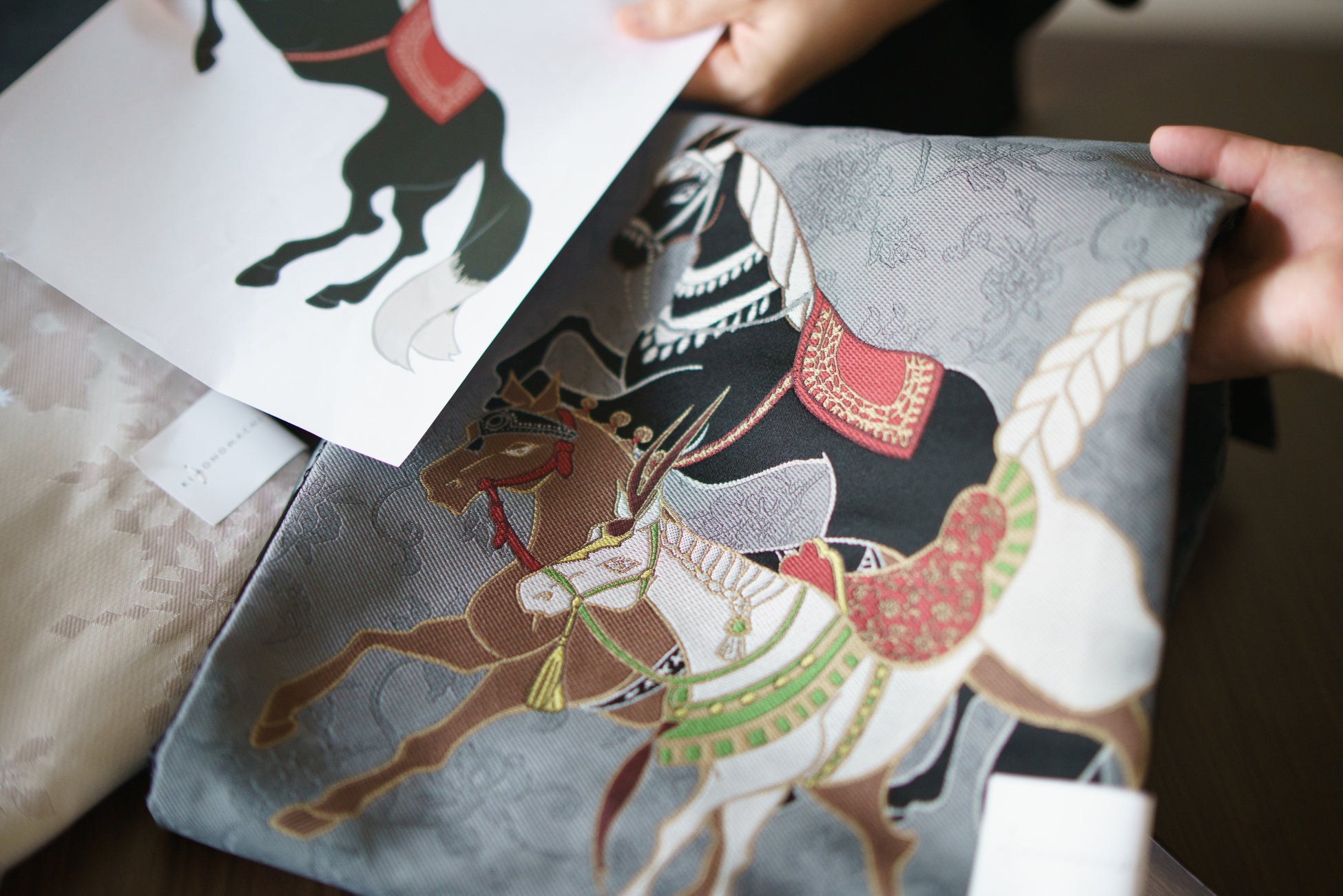 KIMONOMACHIでは「きもの福袋」制作時に、コーディネートする京袋帯もオリジナルでデザイン・制作します。きもの福袋だけでなく、ユーザーの手持ちの着物にもコーディネートしやすいデザインを追求しています。