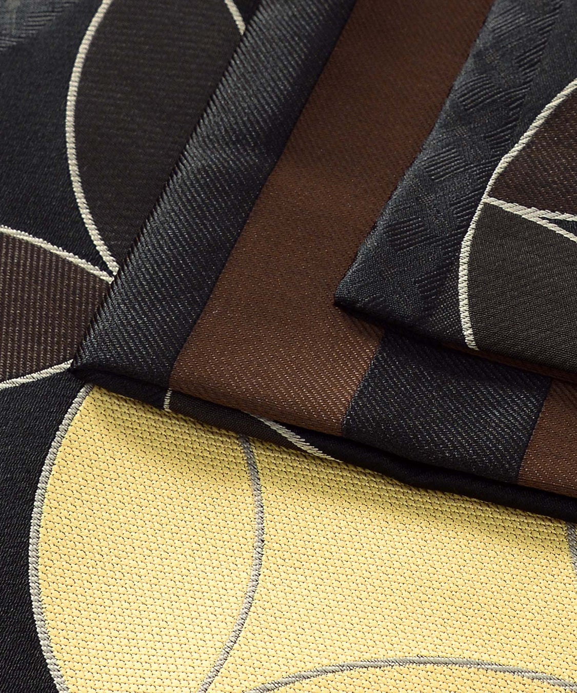 黒地にグレーの輪郭線の大きな七宝繋ぎ文様。七宝の中は、満月と欠けた月をイメージした浅い黄の全円とグレーの欠けた円が並んでいます。地の部分も七宝の区切りに合わせて黒、浅い黒、黒に近いこげ茶と細かく配色されており、個性と繊細さを兼ね備えています。両端に縦に織り出された四弁花。裏は黒と茶色の太いストライプ。
