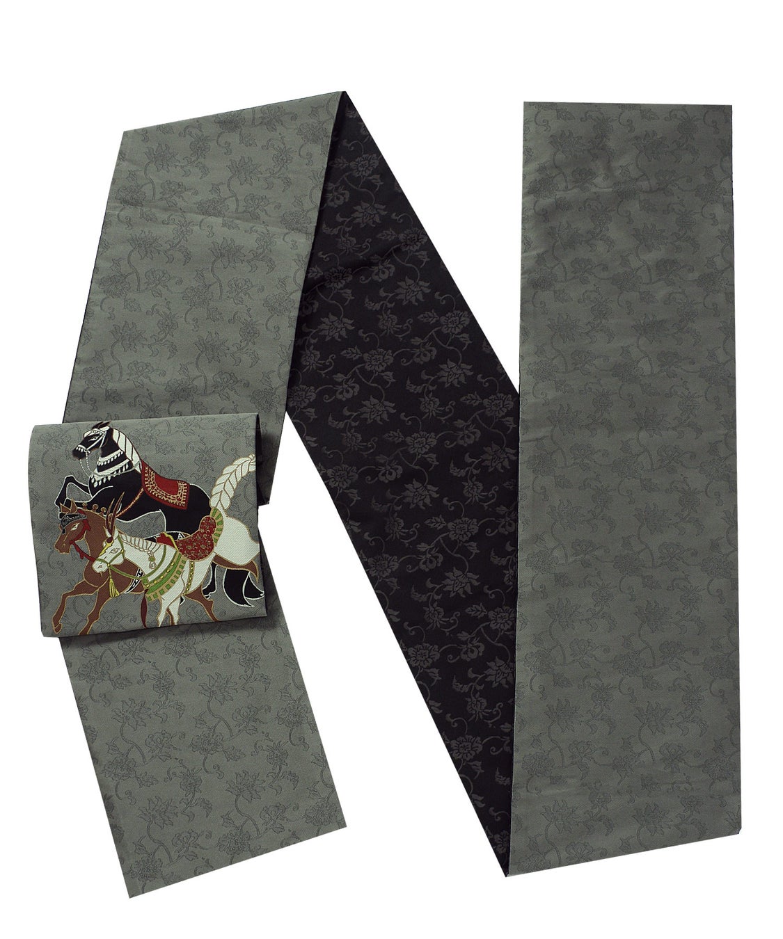 やや黄みのグレーの地に織りで表現された唐花文様。お太鼓部分に黒、茶、白毛の三頭の馬がそれぞれ立ち上がり、駆け出す姿が表現されています。臙脂や緑、白、黄色などの東洋または中東風の馬装や細やかな装飾が魅力です。裏は黒地に織りで表現された唐花文様。