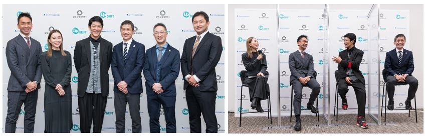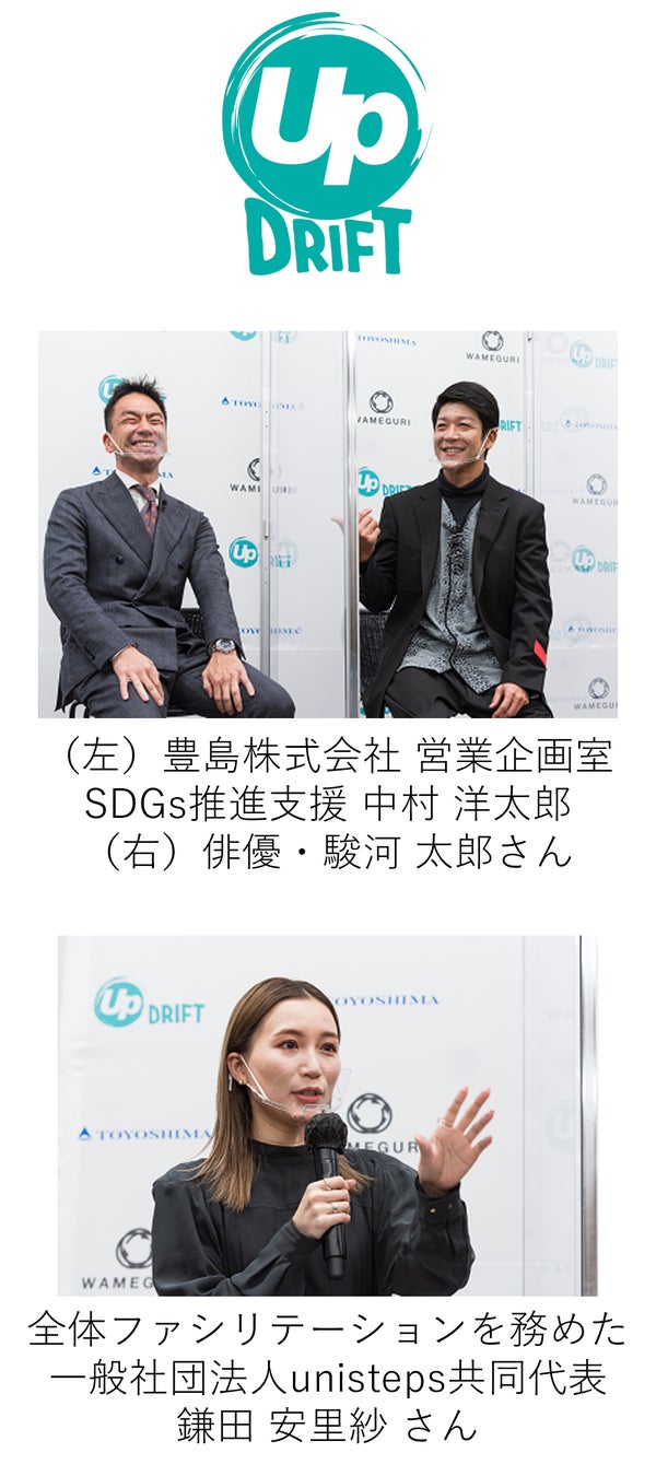 当日は、環境省の岡野 隆宏さんをお招きし、サステナブルファッションの方向性やJSFAへの期待をお話いただくとともに、“循環型ファッション”をテーマに掲げた豊島の新プロジェクト「WAMEGURI(ワメグリ)」を発表。後半には、俳優の駿河 太郎さんもゲストに加え、当社が展開する漂着ペットボトルを再活用した再生ポリエステル「UpDRIFT™ (アップドリフト) 」を軸に、ファッションと環境の今後の繋がり方について語りました。