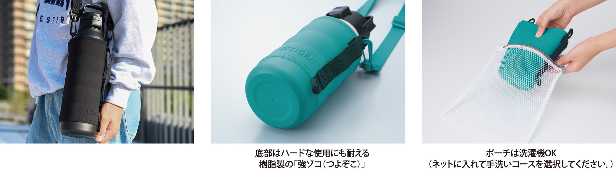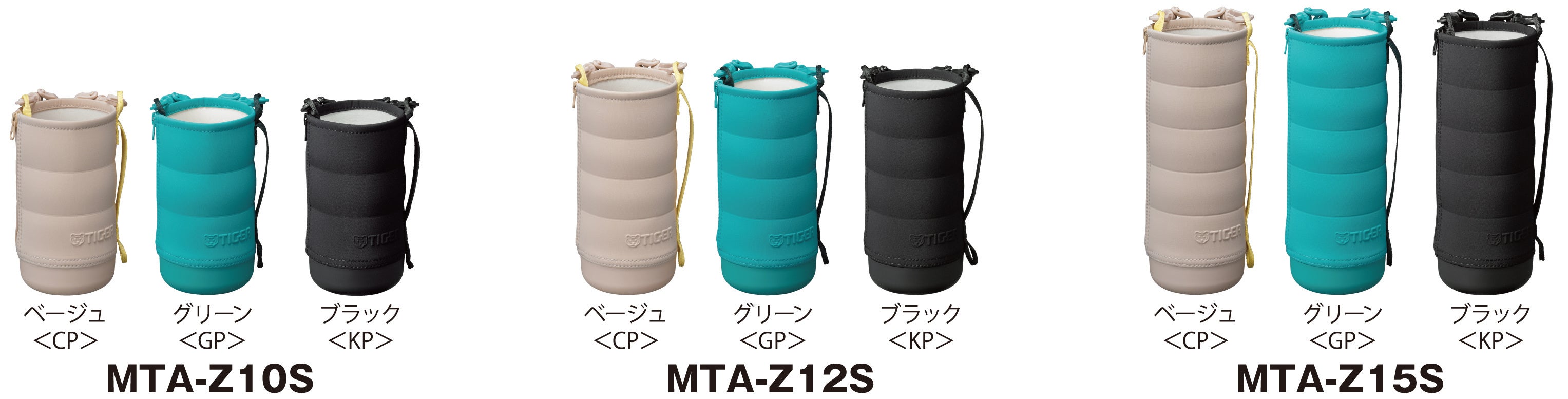 また、別売品の専用ポーチMTA-Z型は、ティーンから大人の方まで幅広くご利用いただけるトレンドを意識したダウン調のデザイン。MTA-B型に取りつけることによって、大容量のボトルをスタイリッシュに持ち運んでいただけます。(真空断熱炭酸ボトルMTA-T120/T150にも取りつけできます。)