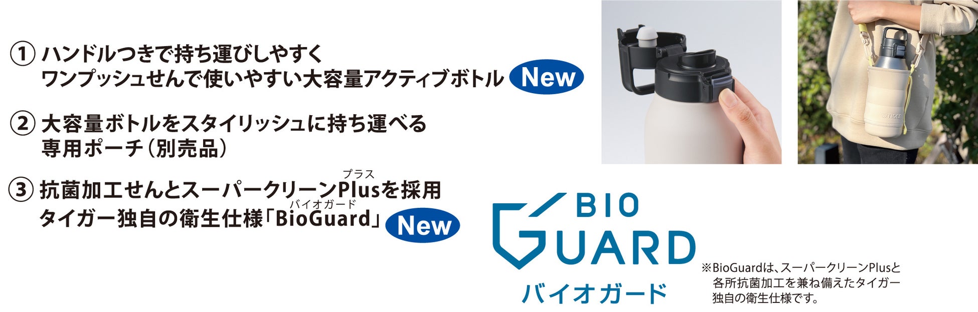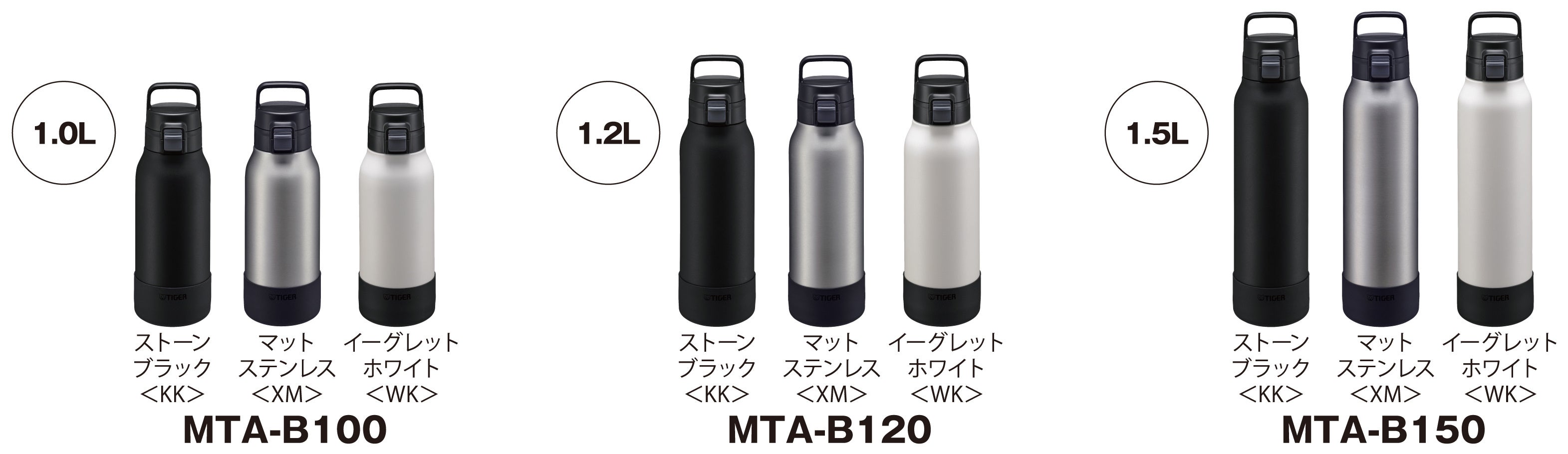 この度、新発売となるMTA-B型は、お客様から、アクティブに使えるハンドルつき大容量ボトルのご要望を受け、1.0L/1.2L/1.5Lの3サイズ展開に。片手で簡単に開けることができ、持ち運びにも便利なハンドルつきワンプッシュせんを採用。ボトルの底面を傷や衝撃から守る着脱可能な抗菌加工底ブーツをつけることで、アクティブなシーンはもちろん、日常生活でも快適にお使いいただけます。