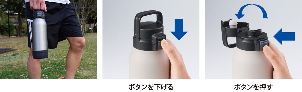 また、ふたはワンプッシュで簡単にオープンするので、片手で操作して、すばやく水分補給することができます。