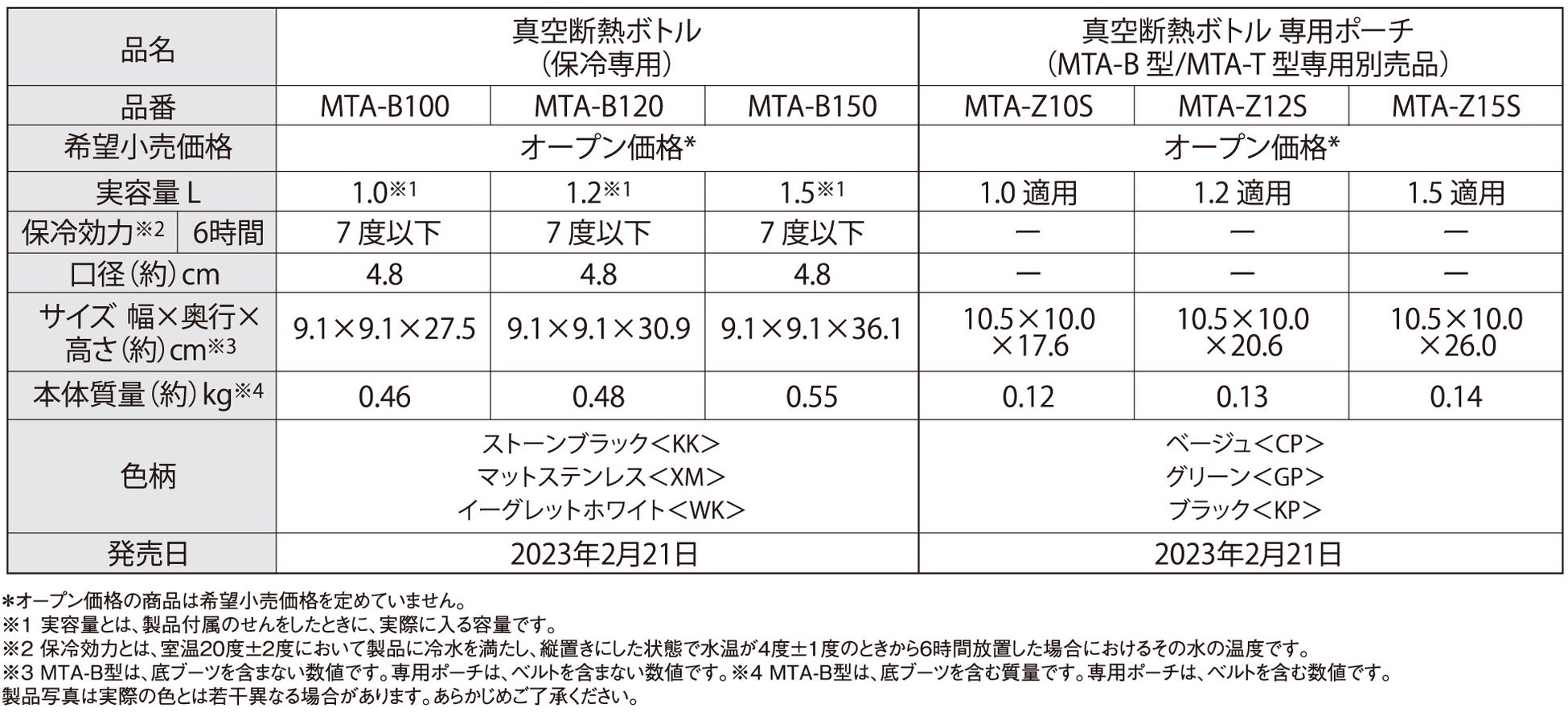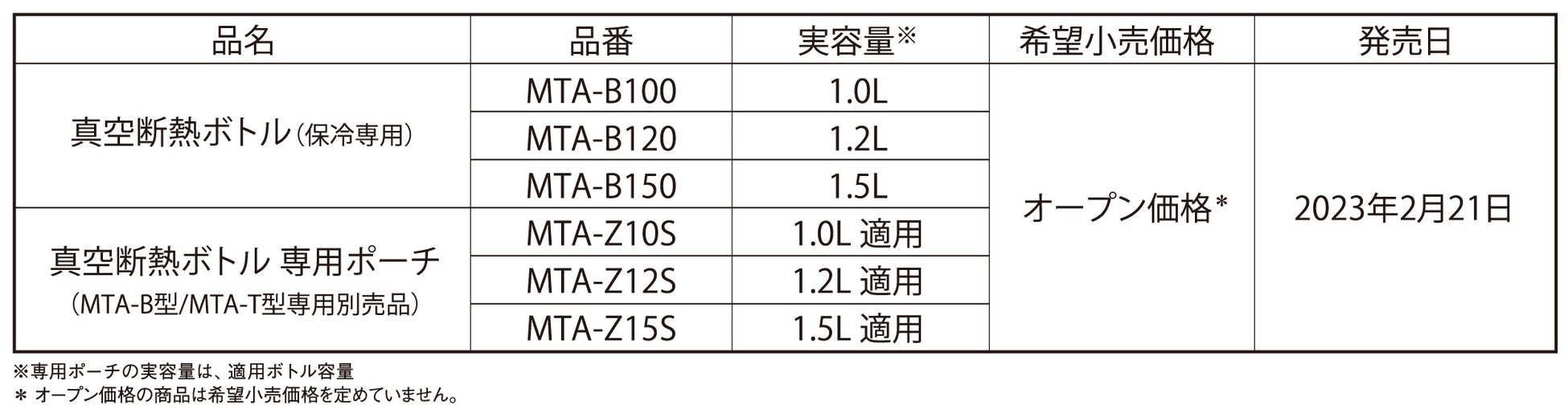 アウトドアやスポーツシーンにフィットする1L超えの大容量ボトルが登場! 真空断熱ボトル(保冷専用)MTA-B100/B120/B150 2023年2月21日発売