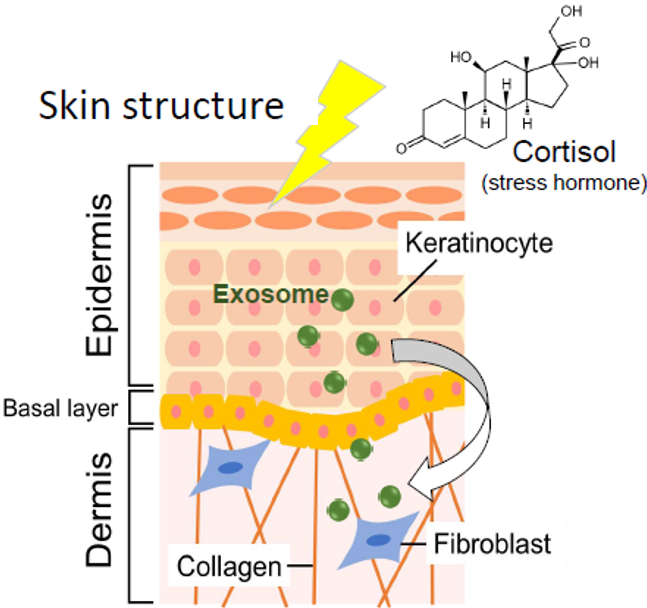 コルチゾールを表皮細胞に添加したところ、表皮細胞が放出するエクソソームの内包物として、コラーゲンの生合成・代謝に関連する因子や、細胞増殖に関連する因子などを調節する情報物質の変化が認められました。これらの結果は、皮膚の弾力性と機能性へ影響を与えうることを示唆しています。