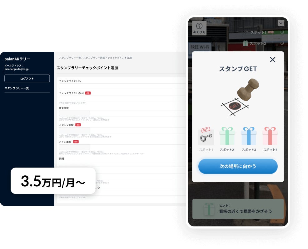 フォトスポットとスタンプラリーはブラウザでご自身で簡単に作成でき、月3.5万円(税抜)からご利用いただけます。