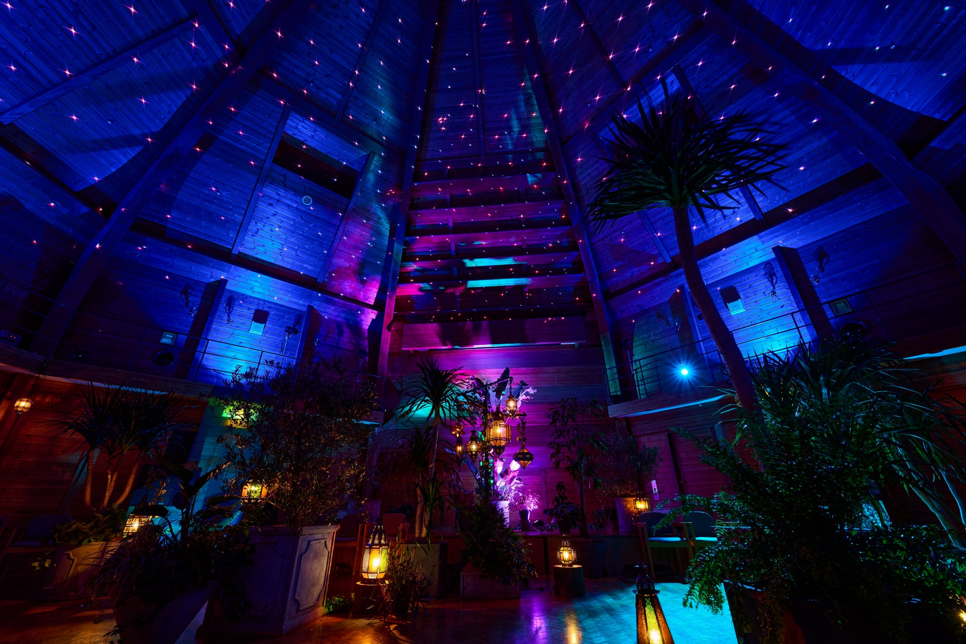 高さ約12m、開放感にあふれ、自然の温もりを感じる木造ホールに、夏限定の”光、音、香り、植物”で演出するリラックス空間が登場。眠りの森、森の中の湖、かがり火の草原、星明りの宇宙、4つのシーン毎に、光や音楽が移り変わります。また、「癒しの森」をイメージした天然エッセンシャルオイルのオリジナルブレンド(ユーカリシトリオドラ、ラベンダー)の香りが癒し空間を更に演出します