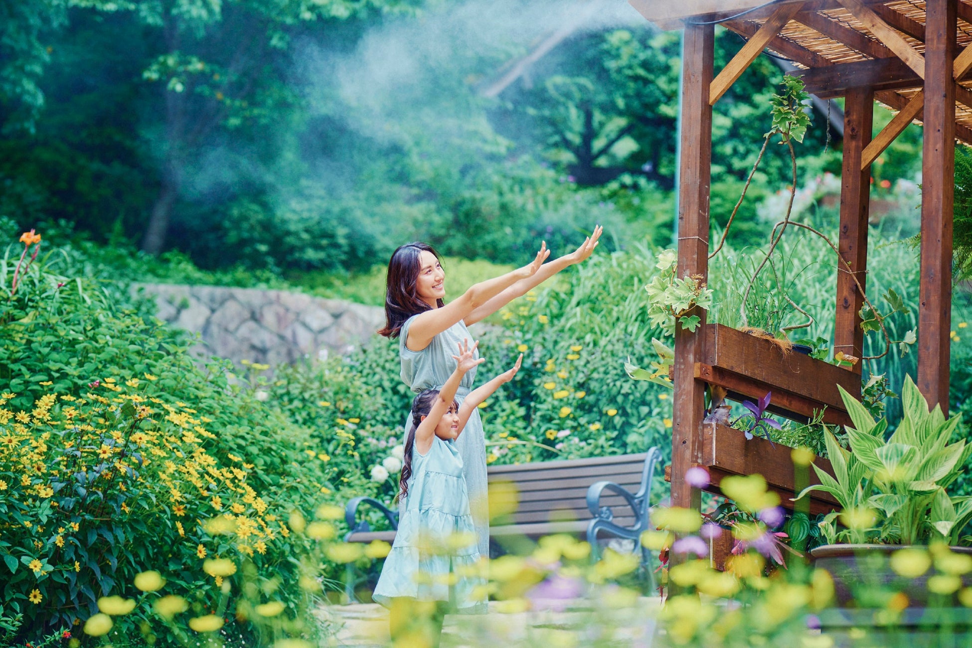 緑溢れるパーゴラがミストに包まれます。ミスト空間に身を置き、”癒し””涼”を感じる夏限定のスポットです