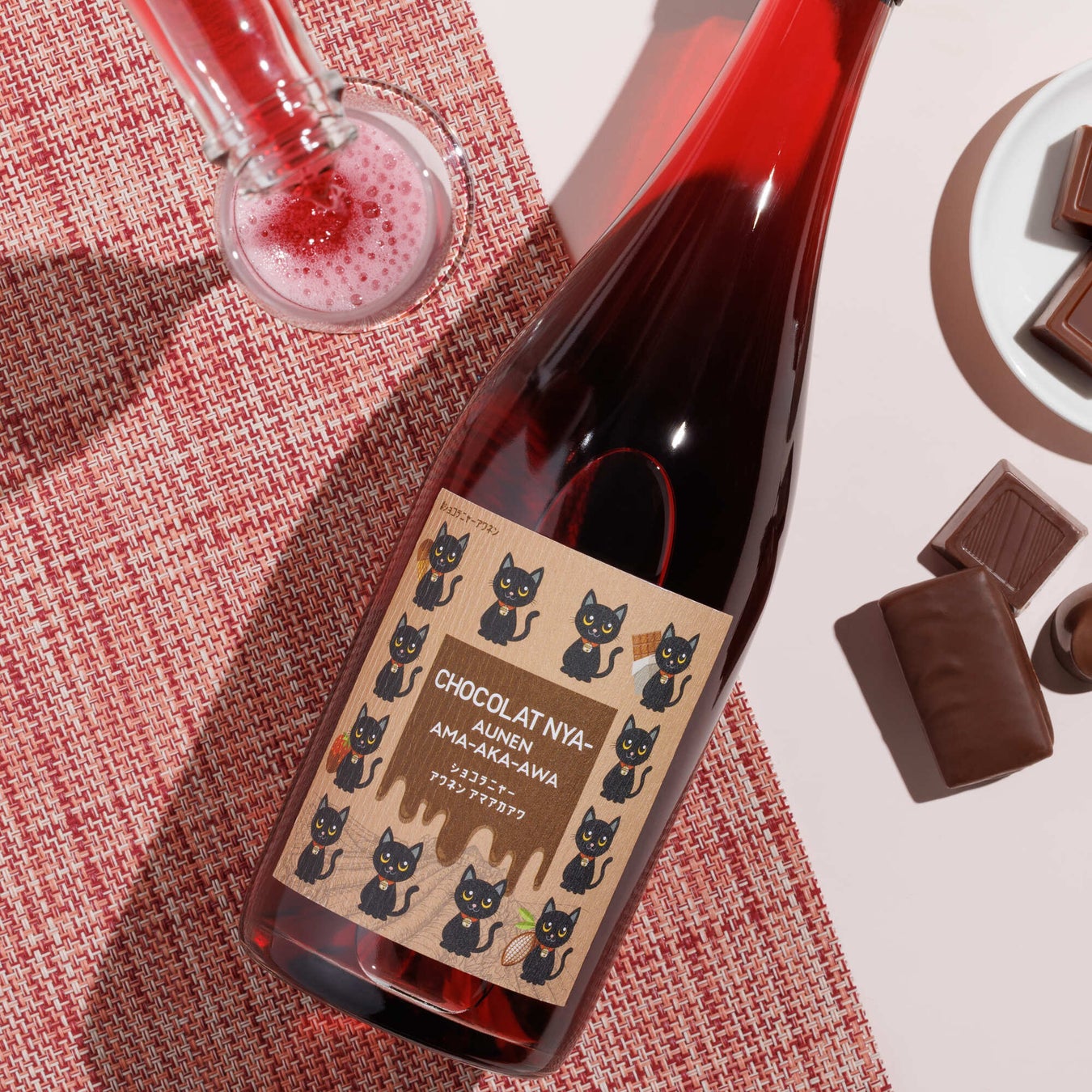 【チョコ好き&猫好き必見】赤のスパークリング×チョコの新発見!12匹の猫が彩る特別な1本「ショコラニャー アウネン アマアカアワ」新発売