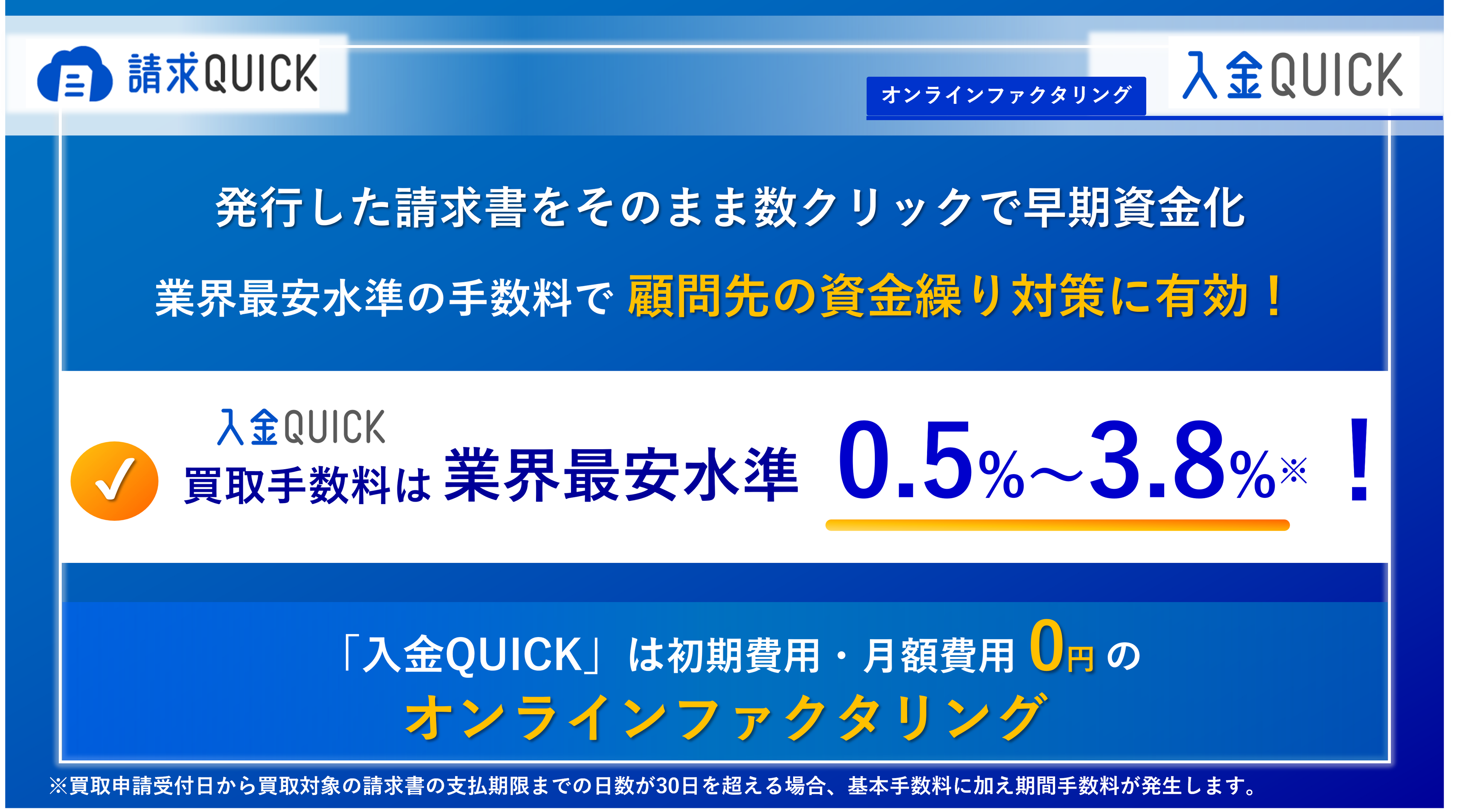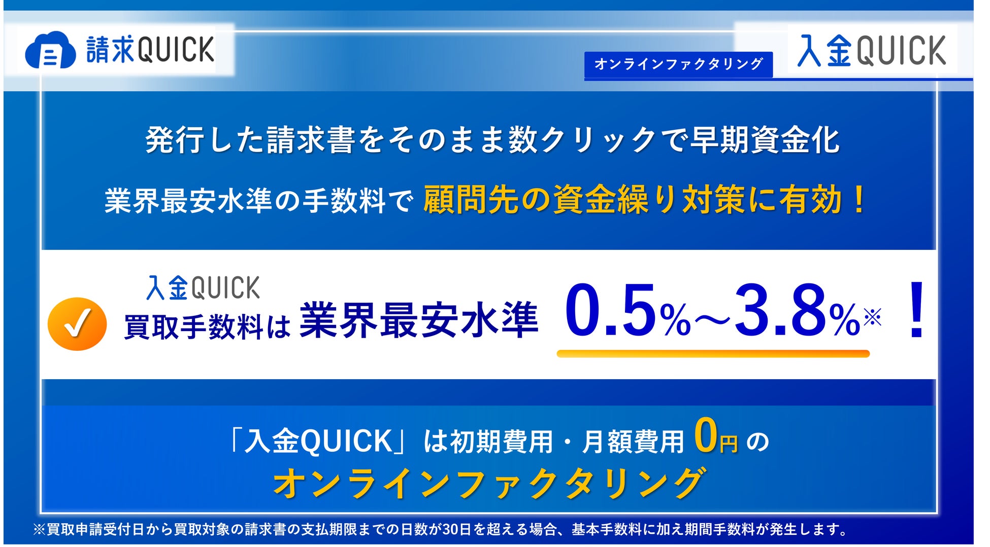 本セミナーでは、顧問先の成長機会を逃さず資金調達の選択肢として有効なオンラインファクタリングサービス「入金QUICK」のご紹介と、税理士・会計事務所様向けの「紹介パートナープログラム」のご案内をいたします。「入金QUICK」は中小企業の資金調達の常識を変えることを目指し、業界最安水準の手数料0.5%~3.8%*1で提供するオンラインファクタリングサービスです。