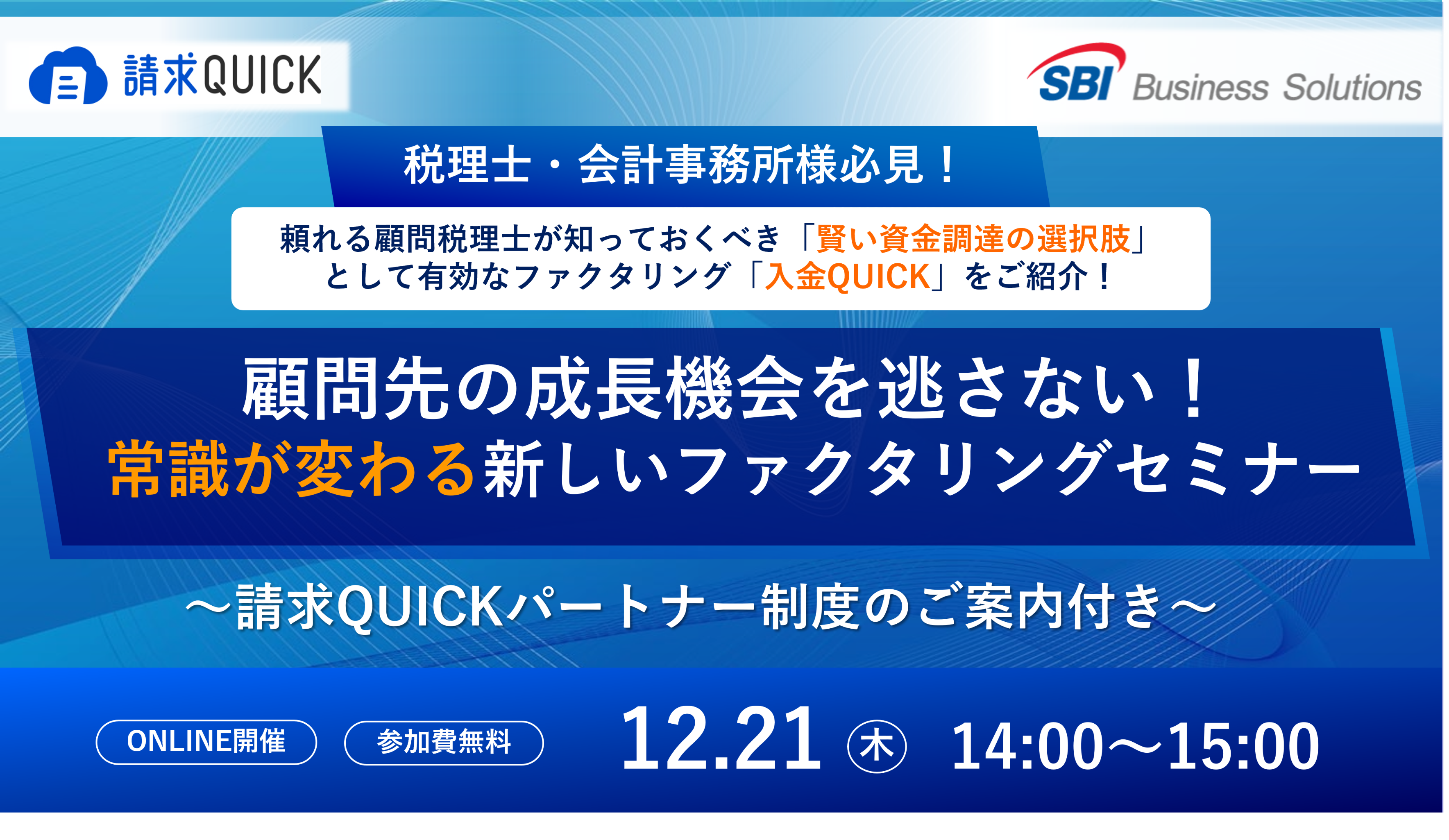 総合フィンテックソリューション企業であるSBI FinTech Solutions株式会社の子会社で、バックオフィス支援サービスを提供するSBIビジネス・ソリューションズ株式会社(本社:東京都港区、代表取締役社長:夏川 雅貴、以下「当社」)は、SBI FinTech Solutions 株式会社(本社:東京都渋谷区、代表取締役社長:金子 雄一、以下「SBI FinTech Solutions」と、税理士・会計事務所様向けに「顧問先の成長機会を逃さない!常識が変わる新しいオンラインファクタリング「入金QUICK」セミナー」を12月21日(木)に開催しますので、お知らせいたします。