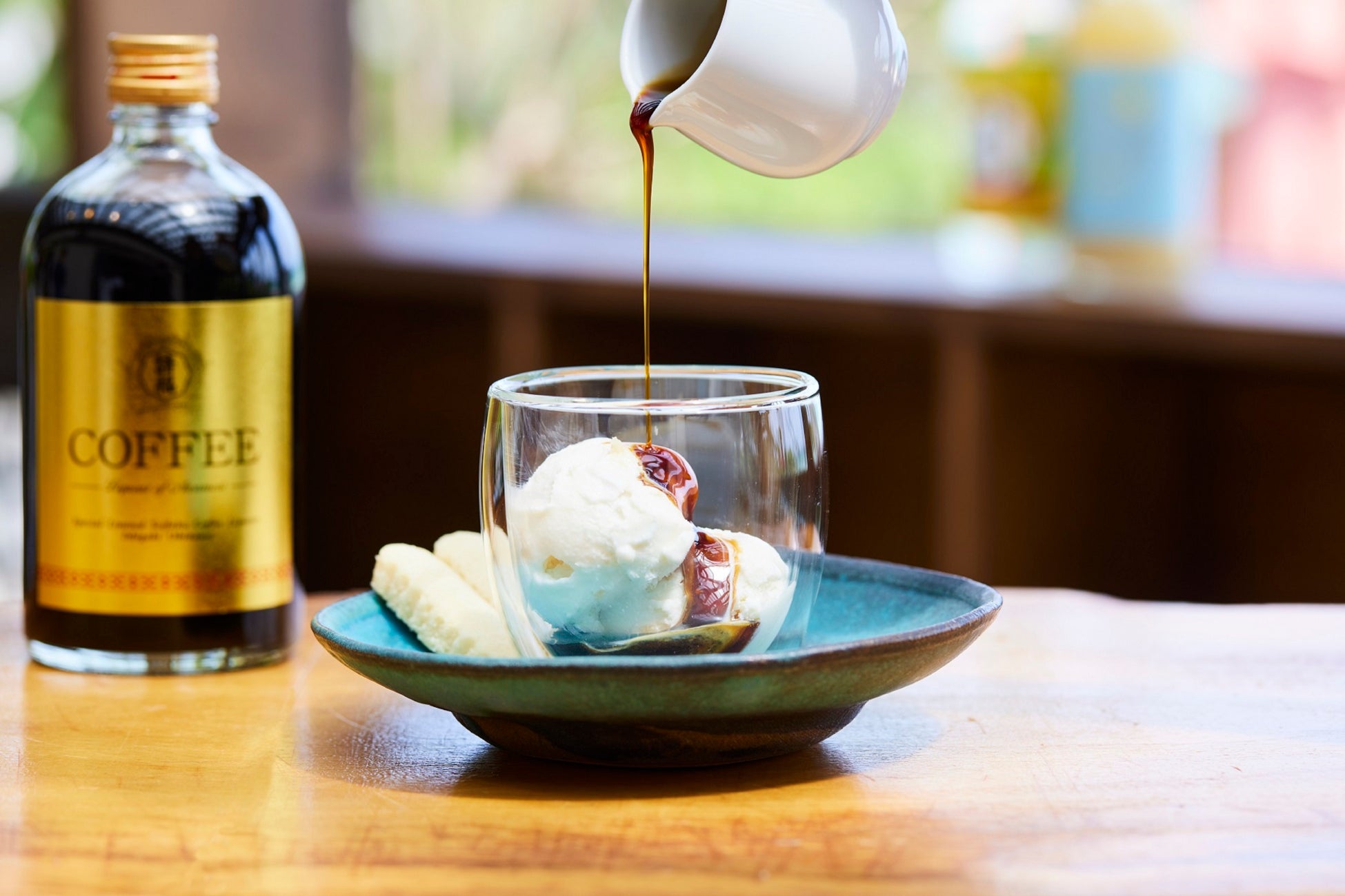 請福酒造が勧めるペアリング体験として、泡盛にコーヒー豆をブレンドした「請福COFFEEリキュール」とアイスクリームを掛け合わせた、アフォガード風に楽しむスイーツを用意します。コーヒーと泡盛の風味が香るリキュールをアイスクリームに注ぐと、ビターで大人な味わいのスイーツを堪能することができます。