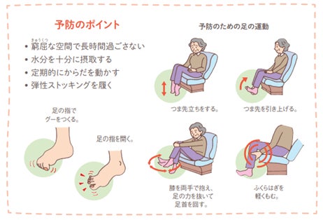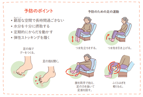 避難所など限られた空間(スペース)での生活や車中泊などにより、からだを自由に動かせない状態が長時間続くと、血行不良により血栓(血のかたまり)ができ、腫れや痛みが生じることがあります(深部静脈血栓症)。