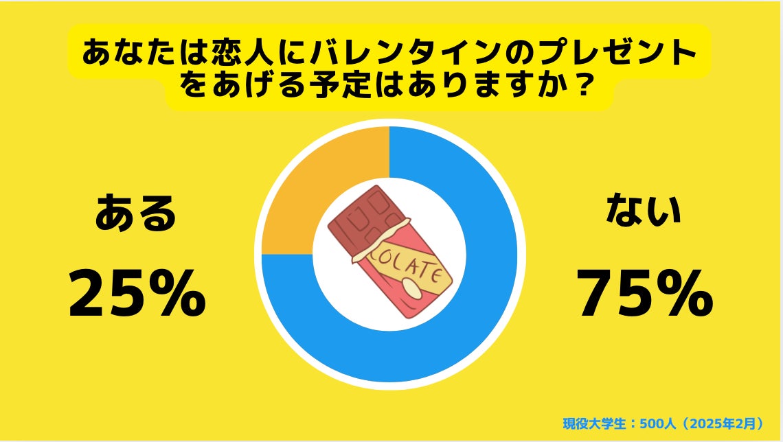 次に、「恋人にバレンタインのプレゼントをあげる予定があるか」質問したところ、25%の大学生が「ある」、75%が「ない」と回答しました。