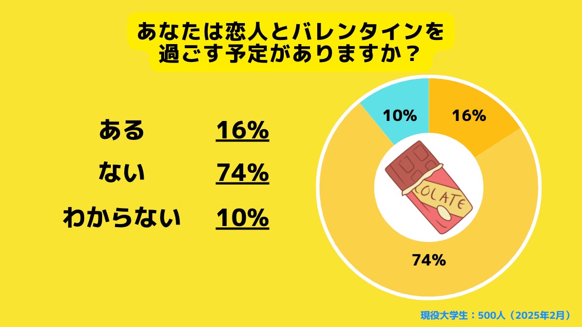 続いて、「恋人とバレンタインを過ごす予定があるか」質問したところ、16%の大学生が「ある」、74%の大学生が「ない」と回答しました。