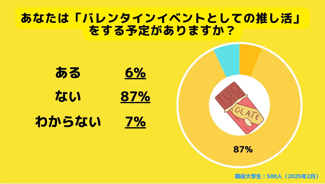 最後に、「バレンタインイベントとしての推し活をする予定があるか」質問したところ、6%の大学生が「ある」、87%の大学生が「ない」と回答しました。約9割の大学生が「推し活をする予定がない」と回答していることから、推し活としてのバレンタインイベントはトレンドではないようです。