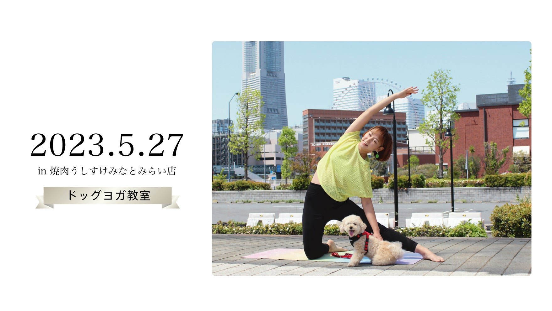 このたびのイベントは、自身も愛犬家で日本ドッグヨーガ普及協会認定講師でもあるMEG氏をむかえ、ペット同飯™可能レストラン「焼肉うしすけ みなとみらい店」(MARINE&WALK YOKOHAMA内)で行う、わんちゃん参加型の屋内イベントとなっております。