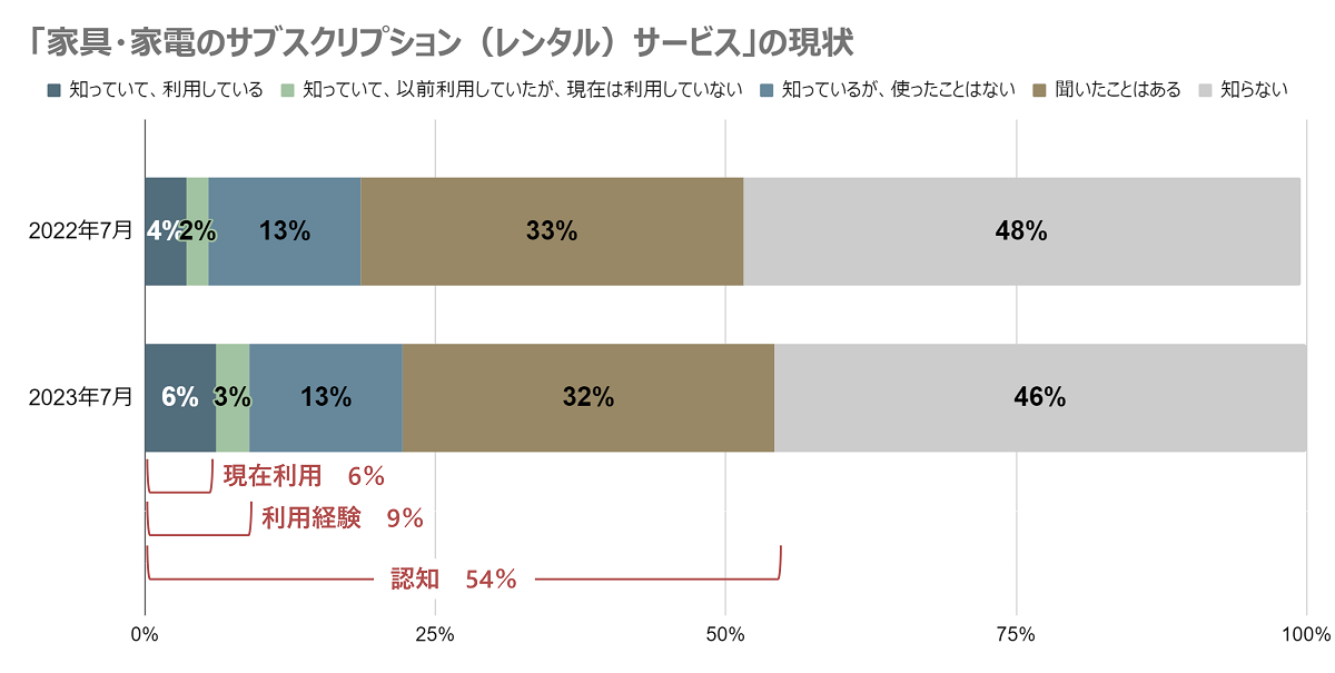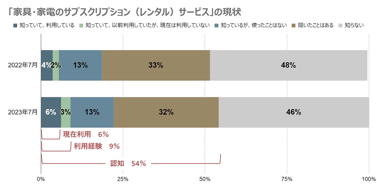・「家具・家電のサブスクリプション(レンタル)サービス」を知っている人、聞いたことはある人は全体の半数以上の54%で、家具や家電を「購入せずに、利用する」、レンタル・サブスクの認知は高まっています。(※2)