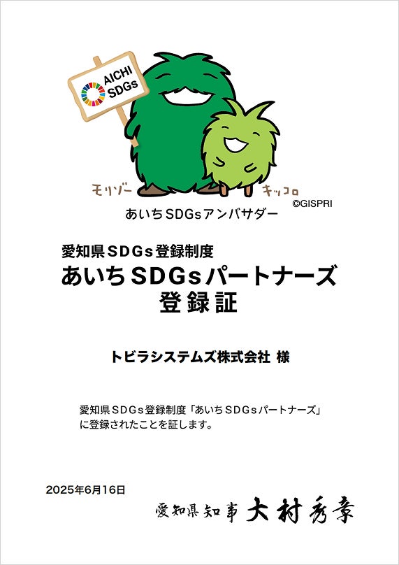 トビラシステムズ株式会社(本社:愛知県名古屋市、代表取締役社長:明田 篤、証券コード:4441、以下「トビラシステムズ」)は、愛知県SDGs登録制度「あいちSDGsパートナーズ」に登録されました。