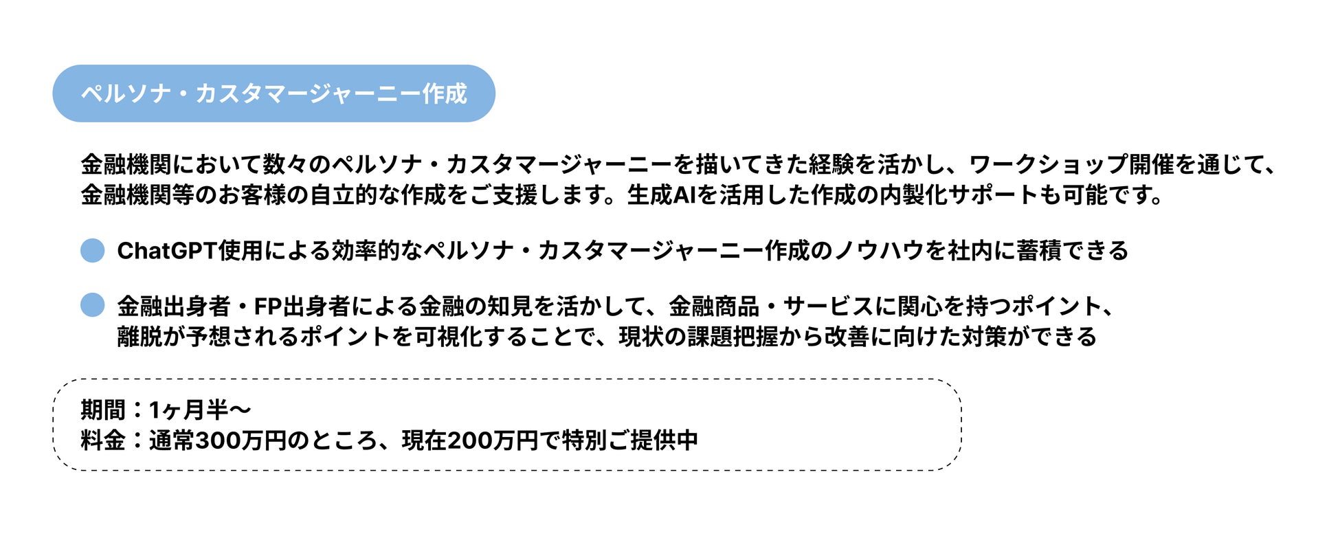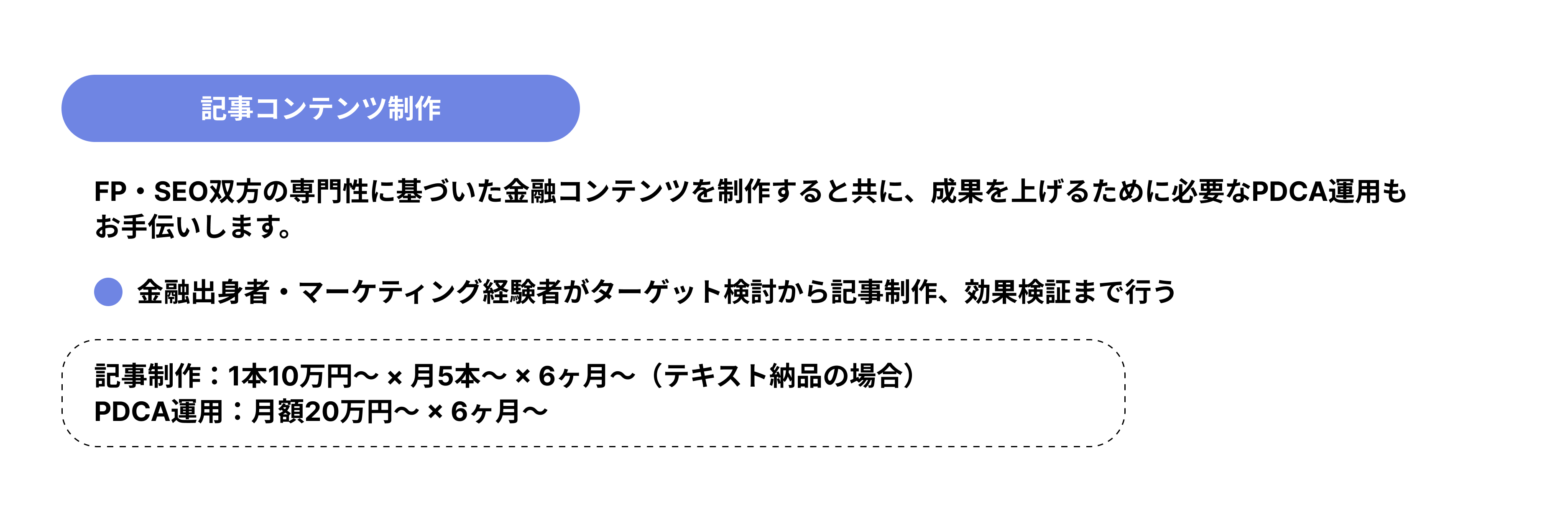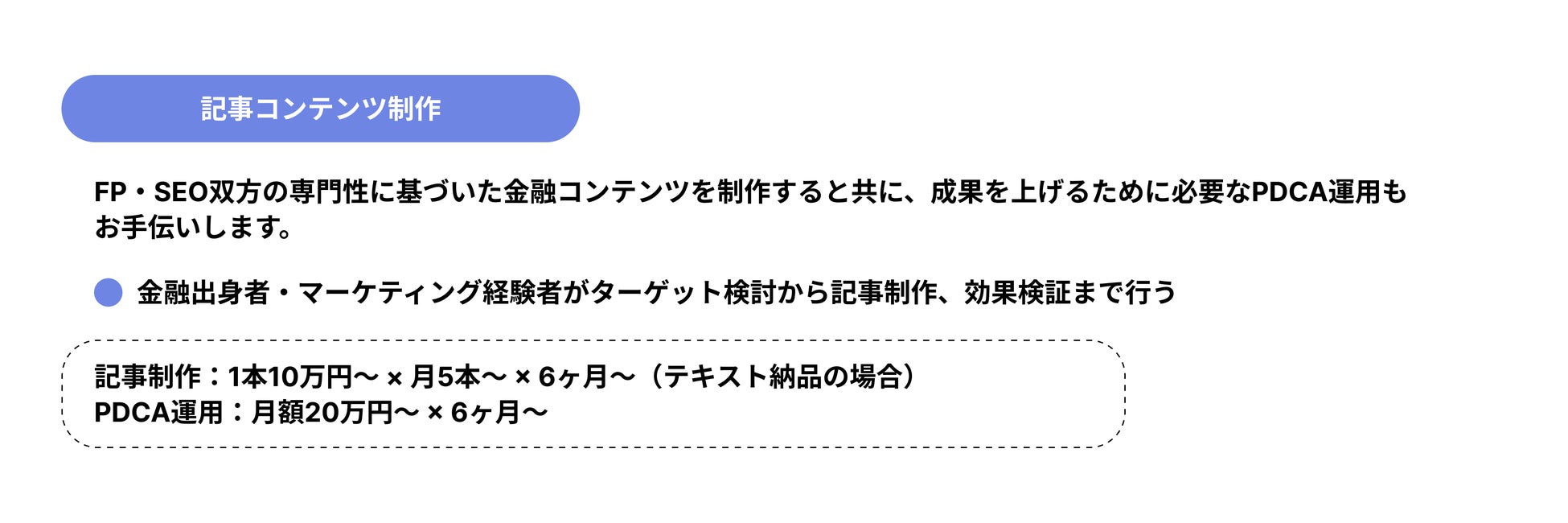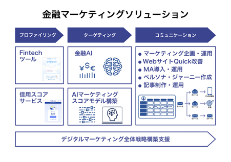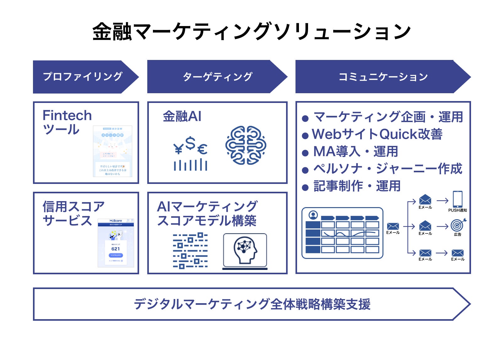 現在、銀行やクレジットカード会社、そして金融ビジネスへの参入を目指す一般事業会社に向けて、ソリューションを提供中。「顧客起点のデジタルマーケティング戦略構築支援」や「家計診断ツール等のデータも活用したAIスコアリングモデル開発」、「FP、SEO双方の専門性に基づいた金融コンテンツ制作」等、プロファイリングからコミュニケーションまで一気通貫なサポートが可能です。