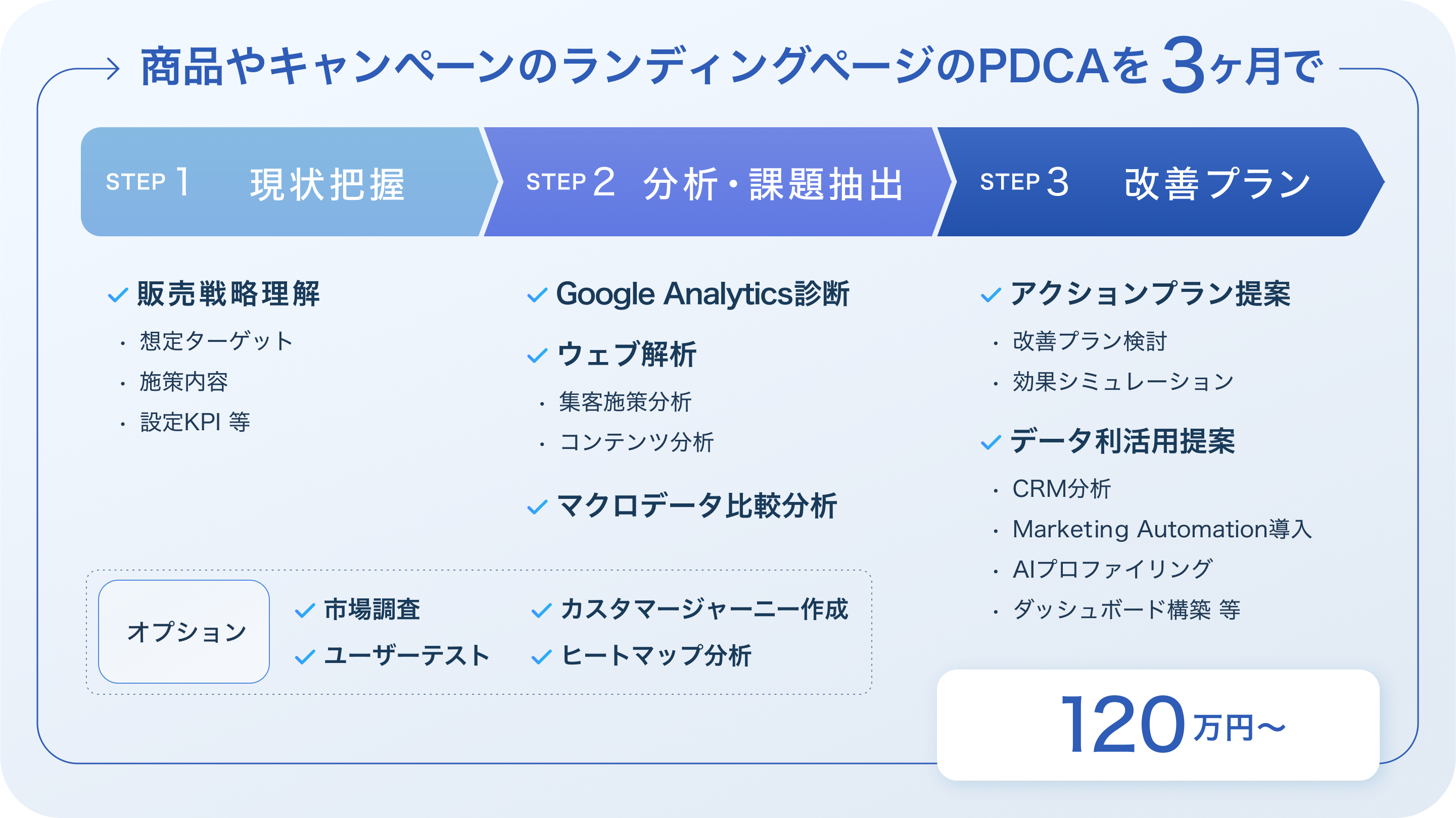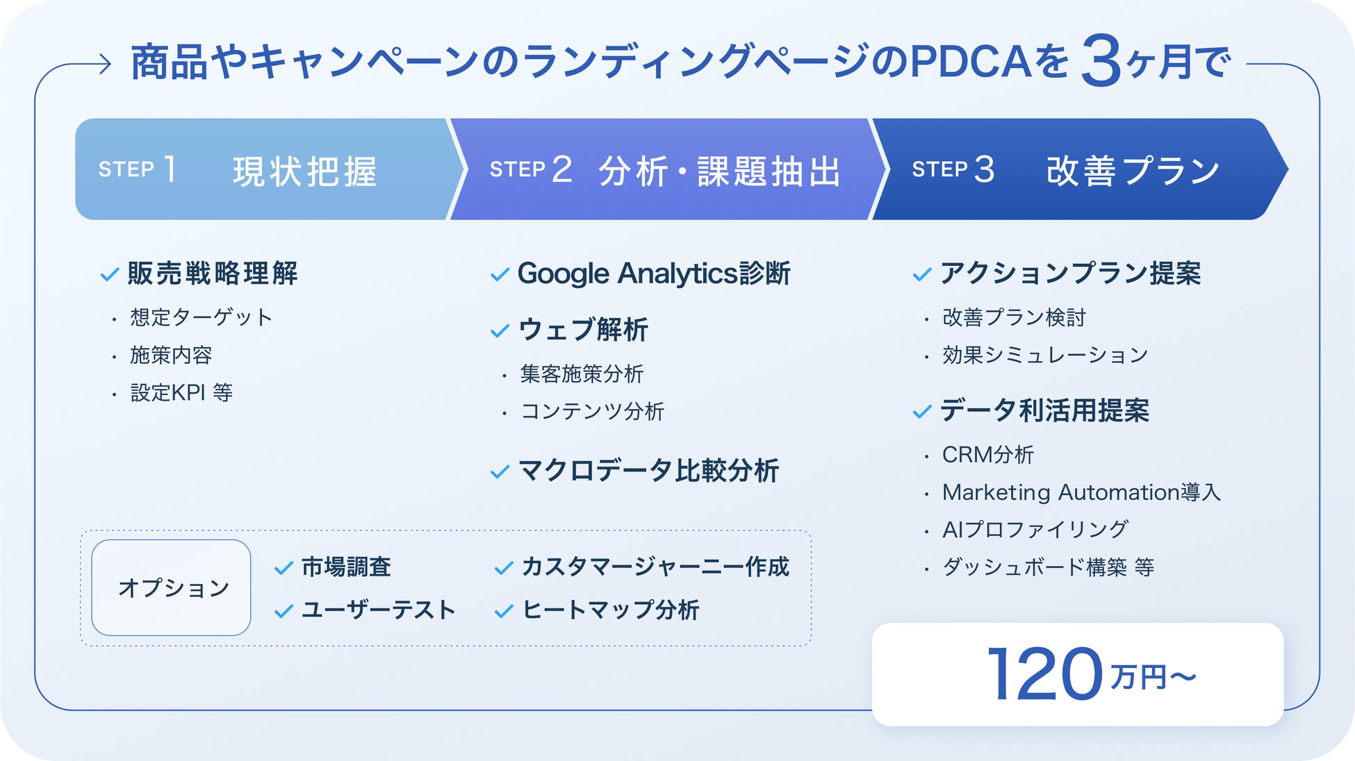 成果を最大限に出すためには、継続的にPDCAサイクルを回していくことが必要ですが、まずはLPサイトの現状把握から分析・課題抽出、改善プラン策定までを3ヶ月で実施します。