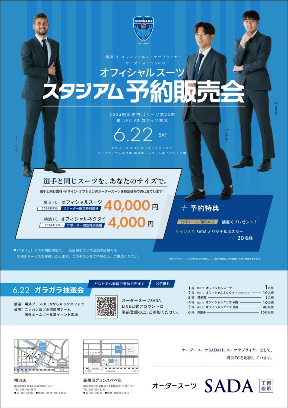 「横浜FC」 オフィシャルスーツサプライヤー オーダースーツSADAオフィシャルスーツ スタジアム予約販売会6月22日(土)開催