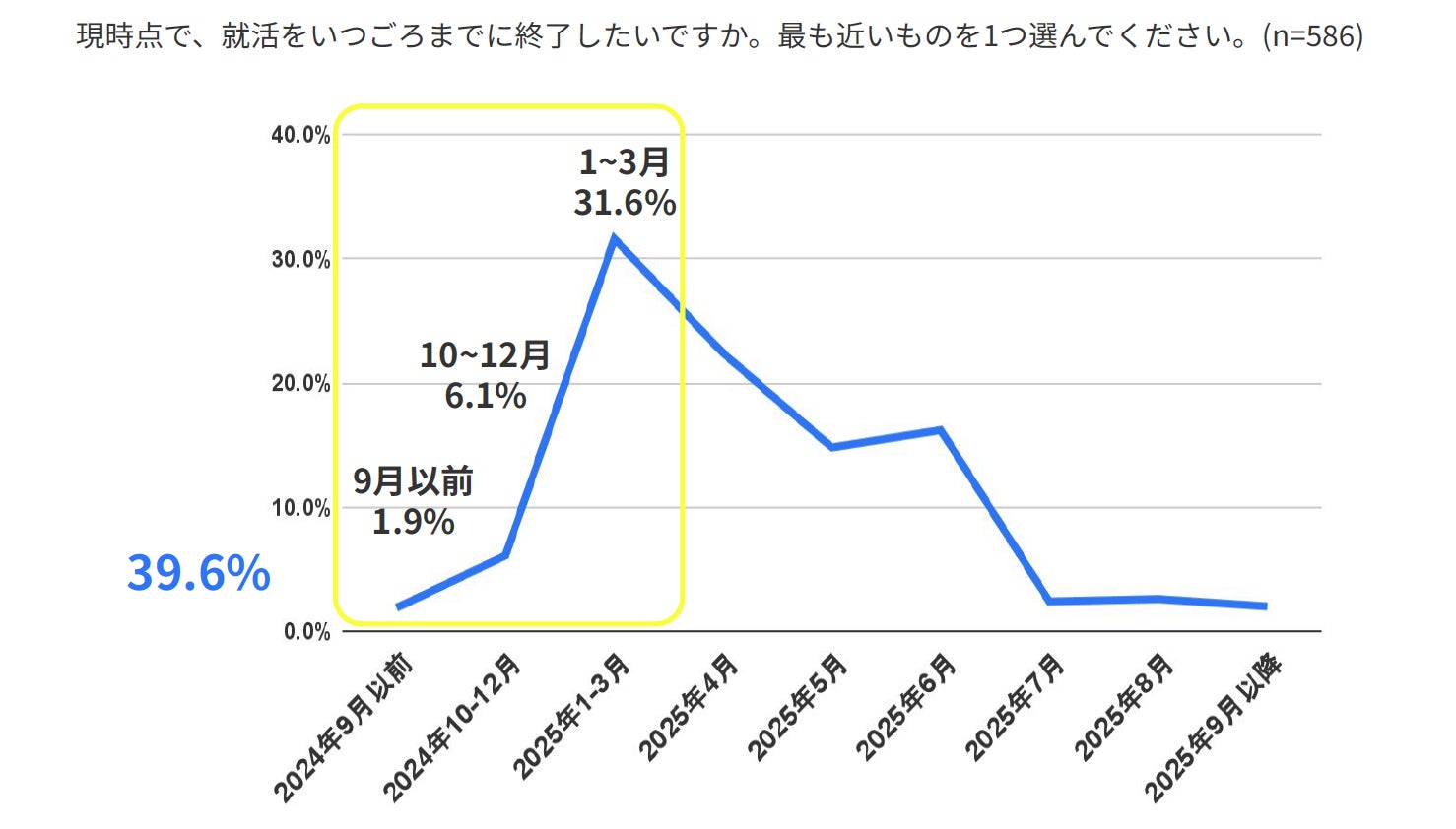 「就活をいつごろまでに終了したいですか」という質問に対しては、「2025年1月~3月(3年生)」という回答が31.6%と最多であり、次いで「2025年4月(4年生)」が22.4%となりました。就活開始時期の早期化と共に、3年生のうち、もしくは4年生の初期のうちに終了させたいという「早期決着」のニーズが高いことがうかがえます。