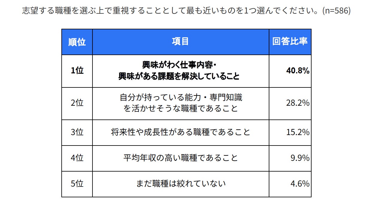 「志望職種を決める際に重視すること」に関する質問では、志望職種を決める軸は「興味がわく仕事内容・興味がある課題を解決していること」が最多の40.8%であり、次いで「自分の能力・専門知識を活かせること」(28.2%)、「将来性・成長性があること」(15.2%)と続き、「平均年収が高い職種」であることは4番目の9.9%という結果でした。