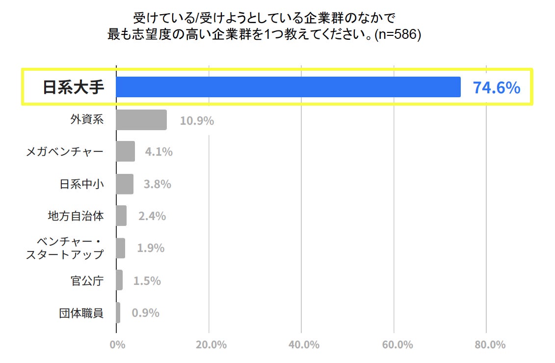 「受けている/受けようとしている企業群のなかで最も志望度の高い企業群」について尋ねたところ、「日系大手企業」が最多の74.6%でした。また、「日系大手企業」と回答した学生を対象にした「日系大手企業を受けたい理由」に関する質問では「福利厚生が充実しているから」が45.8%、次いで「会社やサービス・商品に知名度があるから」(26.1%)という結果でした。