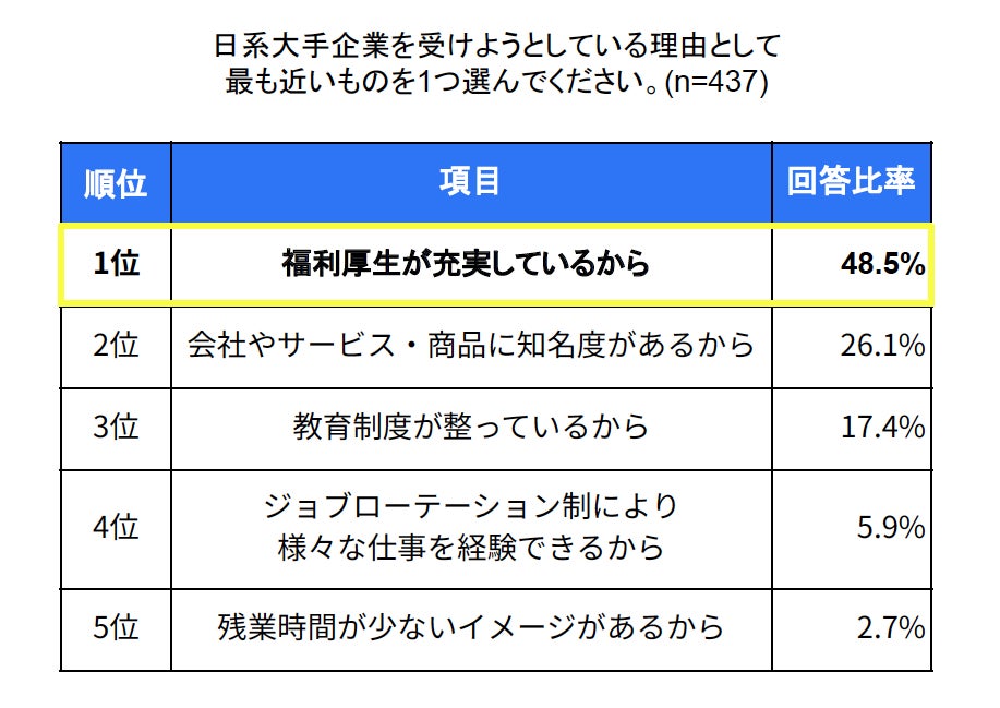 志望度の高さは日系大手企業が最多。理由は「福利厚生が充実しているから」